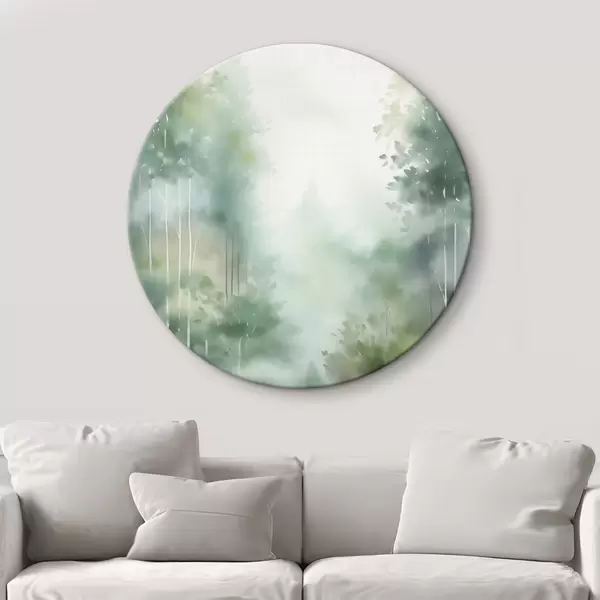 Кругла картина Акварельний малюнок, що імітує абстрактний ліс з високими деревами та зеленим листям, м'які приглушені кольори Nr r46689