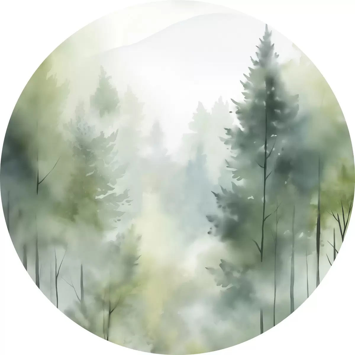 Кругла картина Акварельний малюнок, що імітує туманний ліс з високими соснами та горами на задньому плані r46690