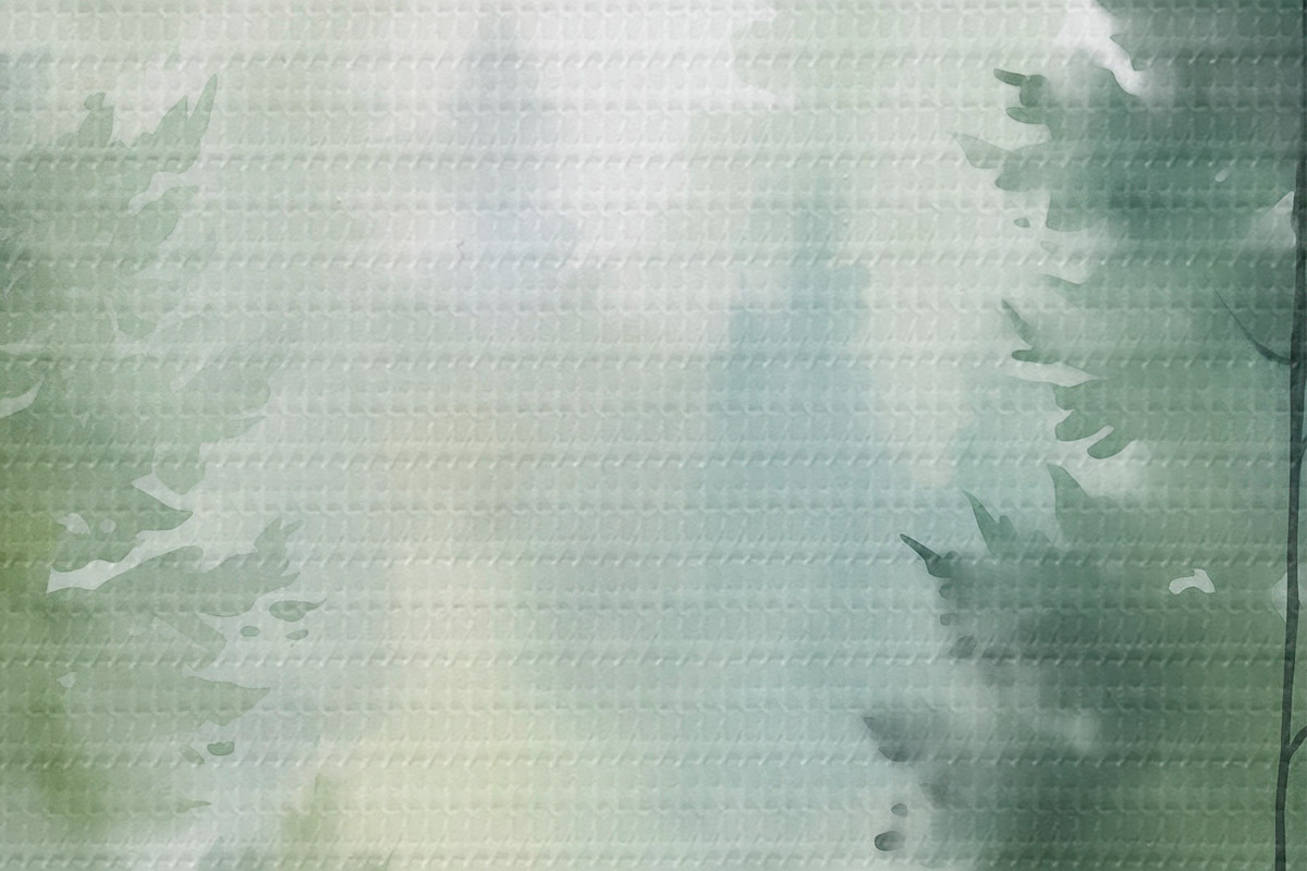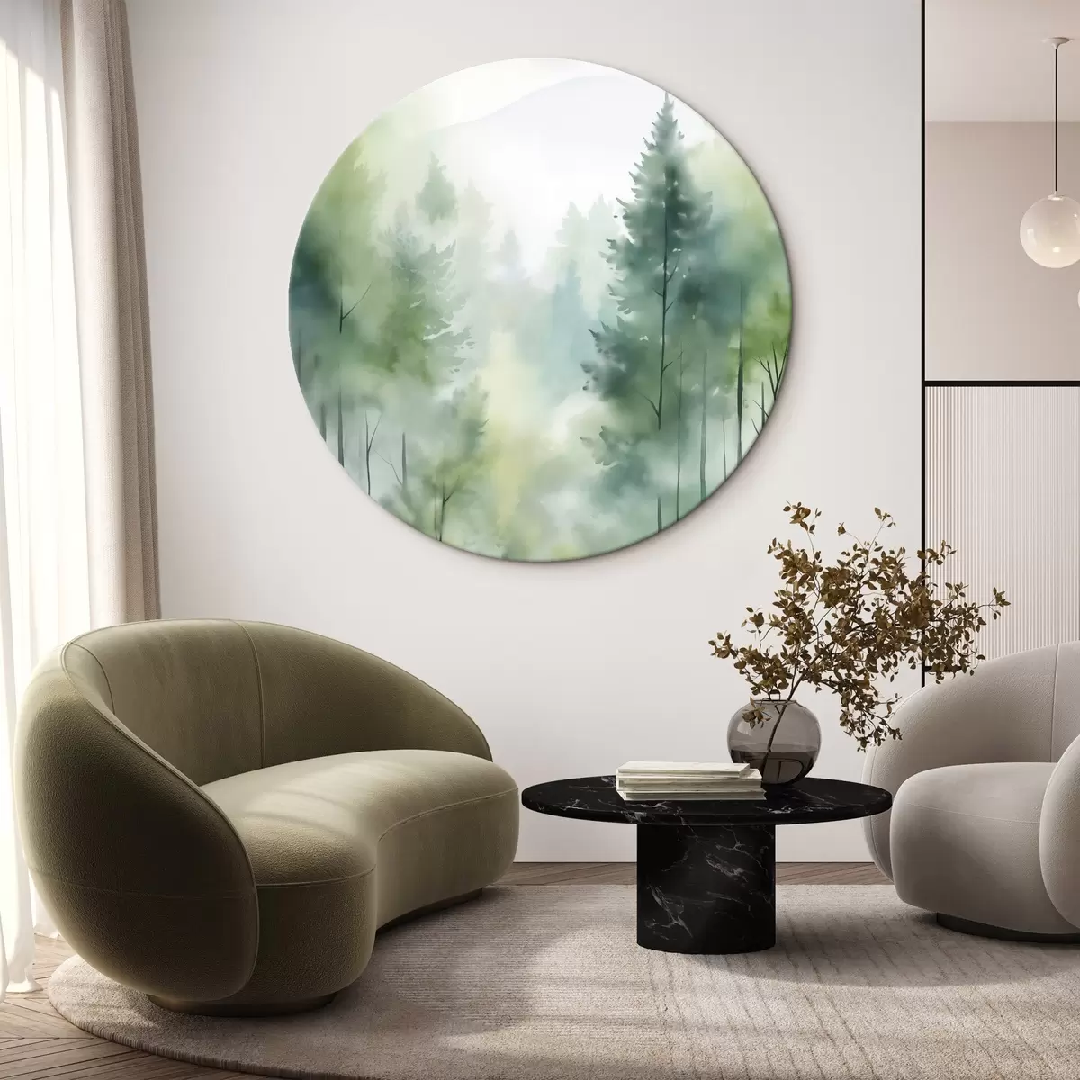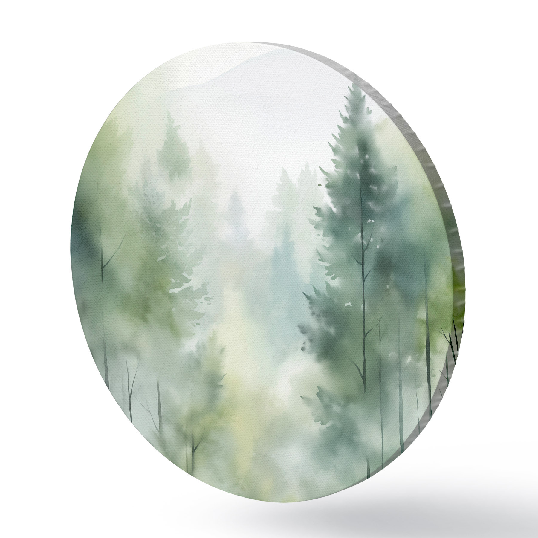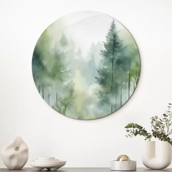 Кругла картина Акварельний малюнок, що імітує туманний ліс з високими соснами та горами на задньому плані Nr r46690