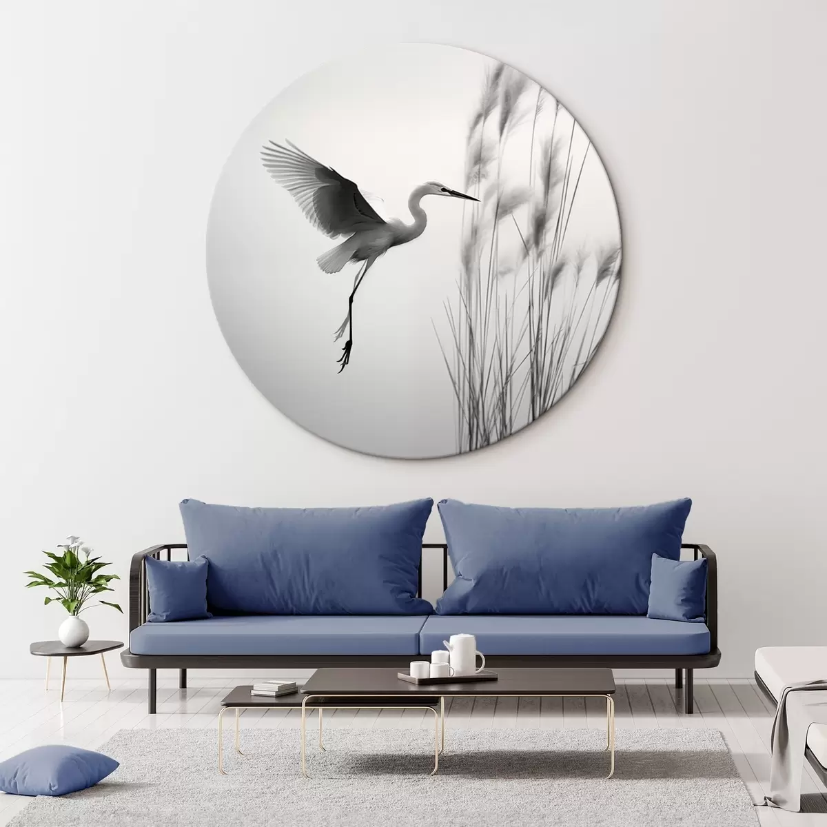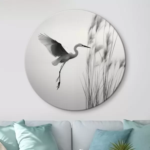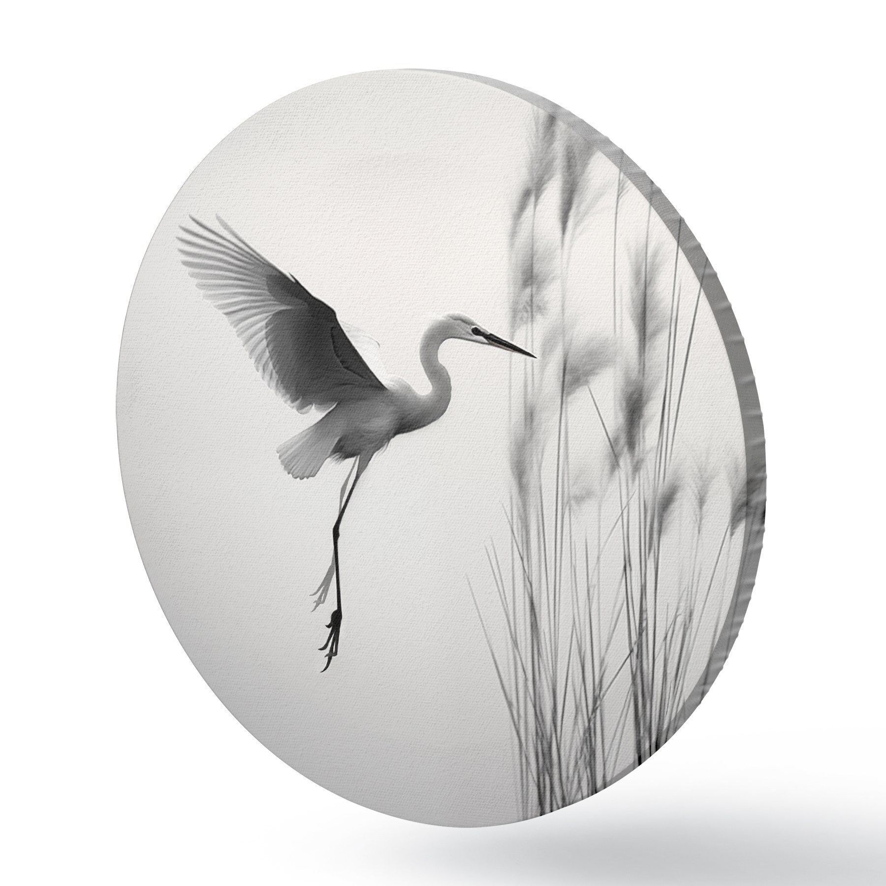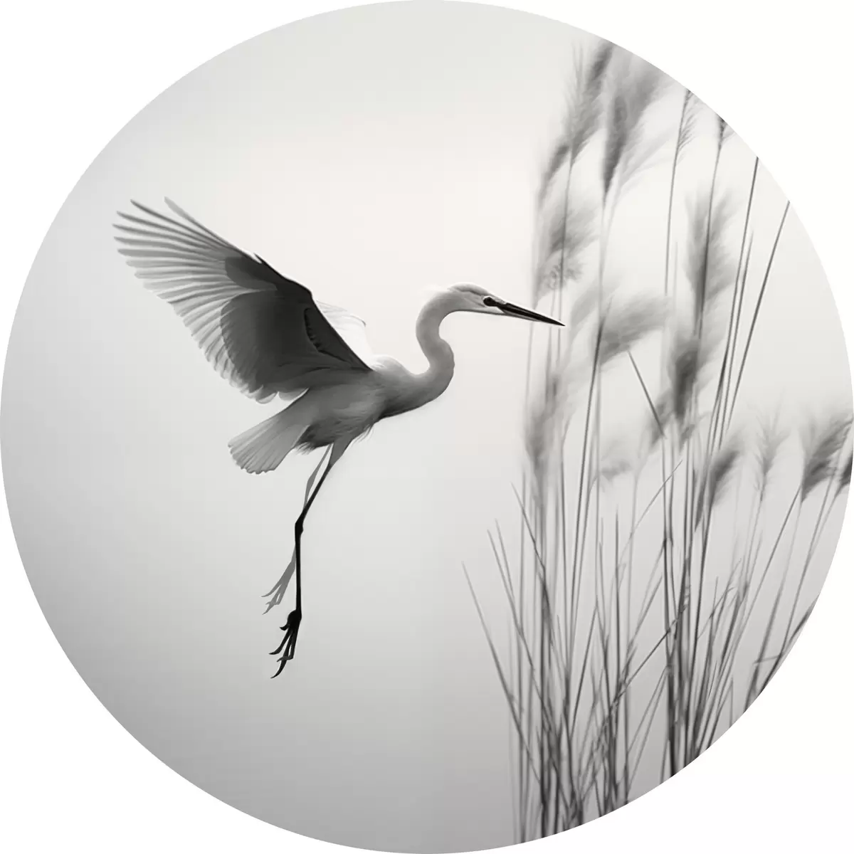 Кругла картина Біла чапля з розпростертими крилами, що летить біля високих очеретів, чорно-біла мінімалістична композиція Nr r46693