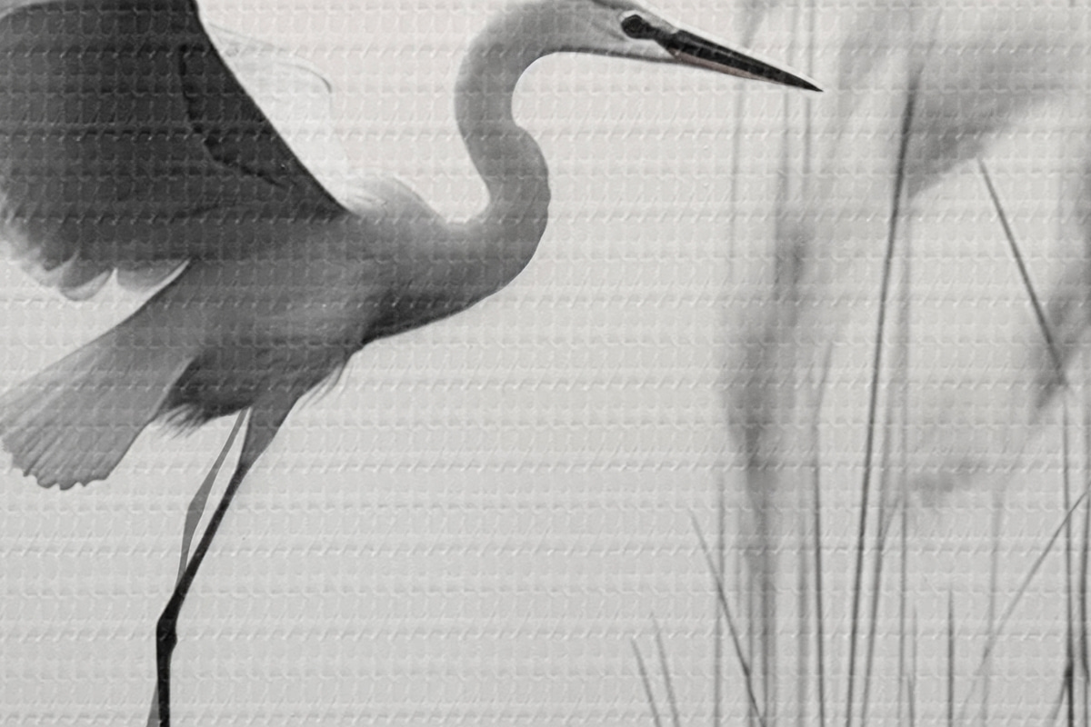 Кругла картина Біла чапля з розпростертими крилами, що летить біля високих очеретів, чорно-біла мінімалістична композиція r46693