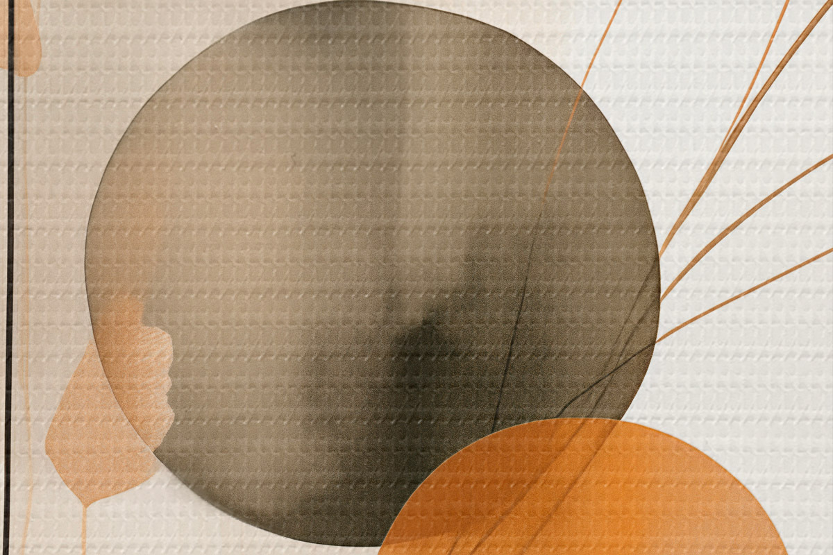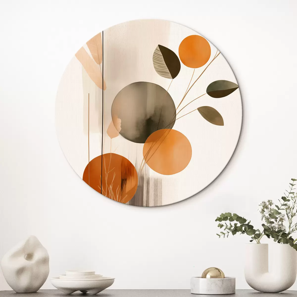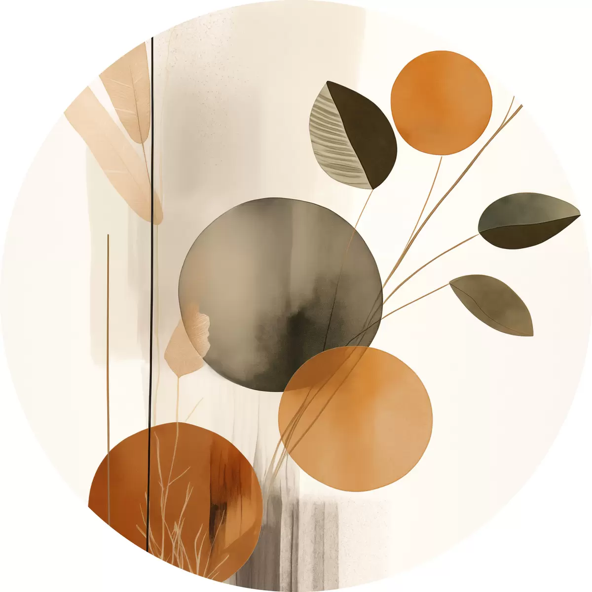 Кругла картина Абстрактна імітація живопису з помаранчевими та сірими колами, листям і гілками, сучасний стиль, ефект акварелі r46697