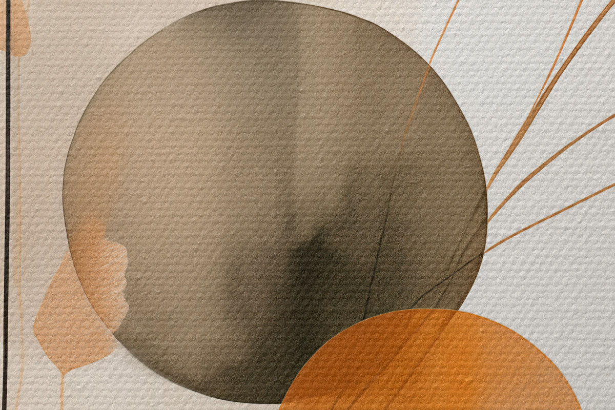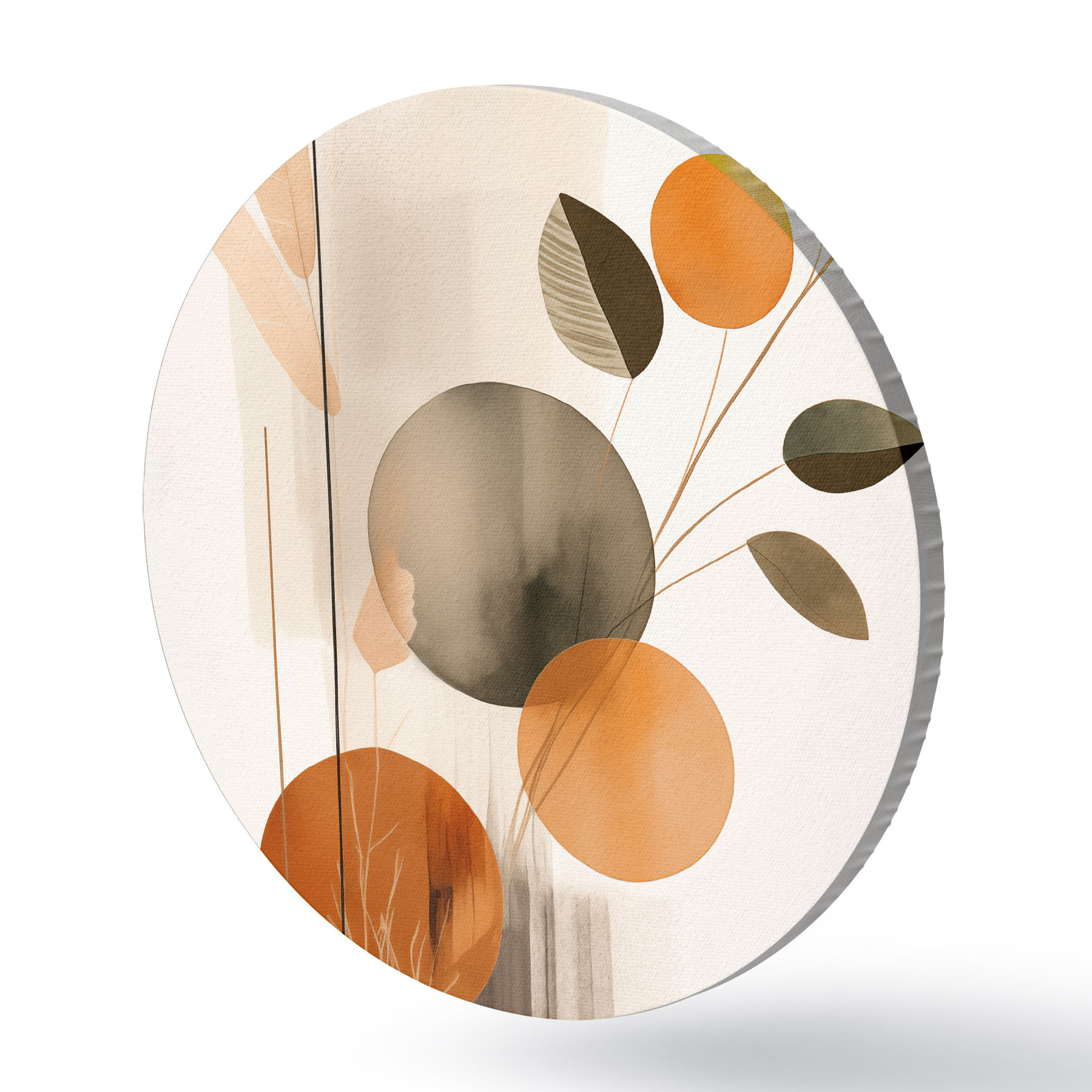 Кругла картина Абстрактна імітація живопису з помаранчевими та сірими колами, листям і гілками, сучасний стиль, ефект акварелі Nr r46697