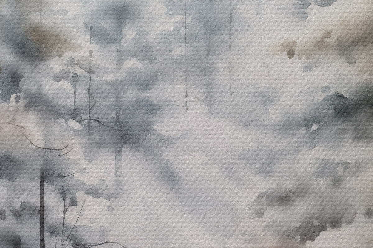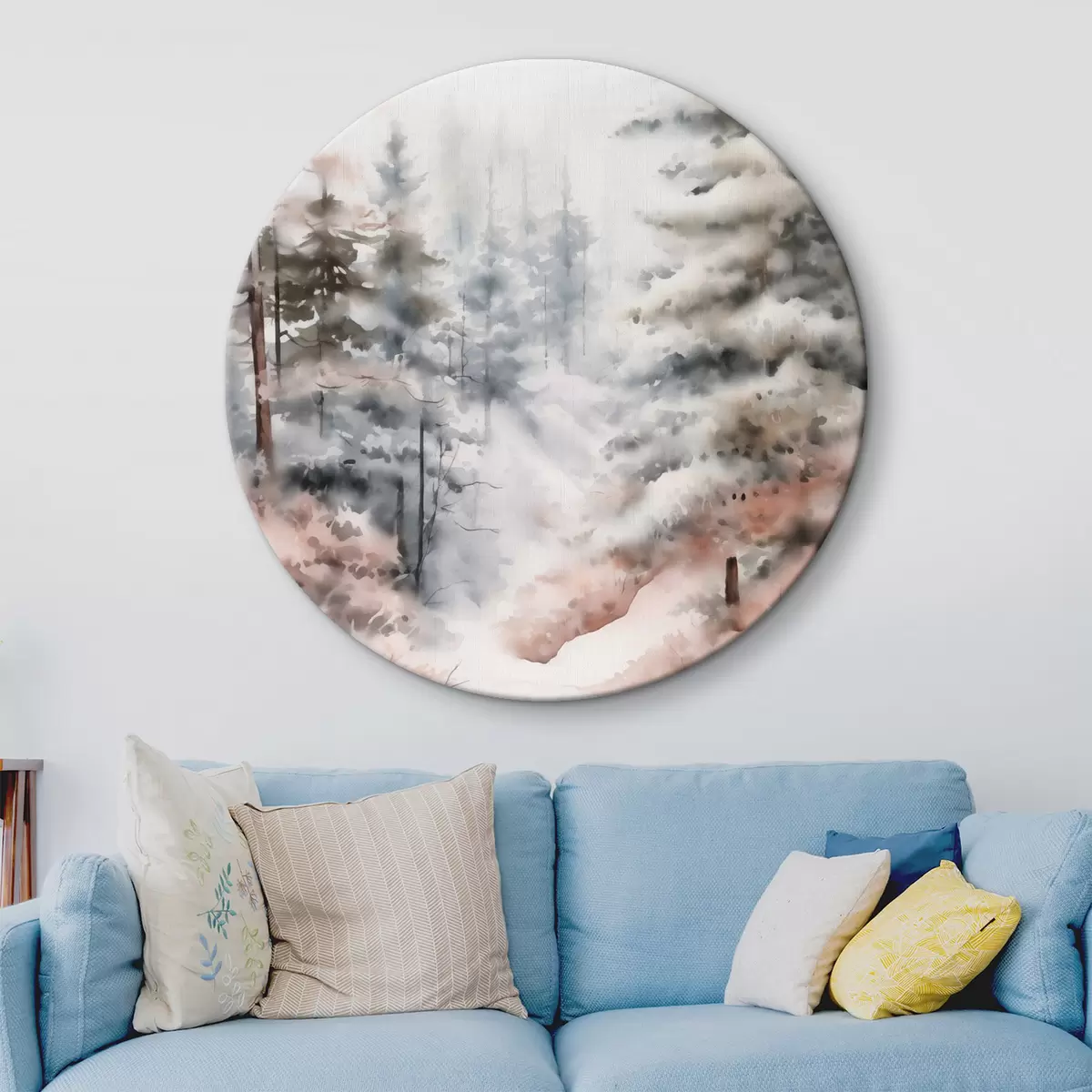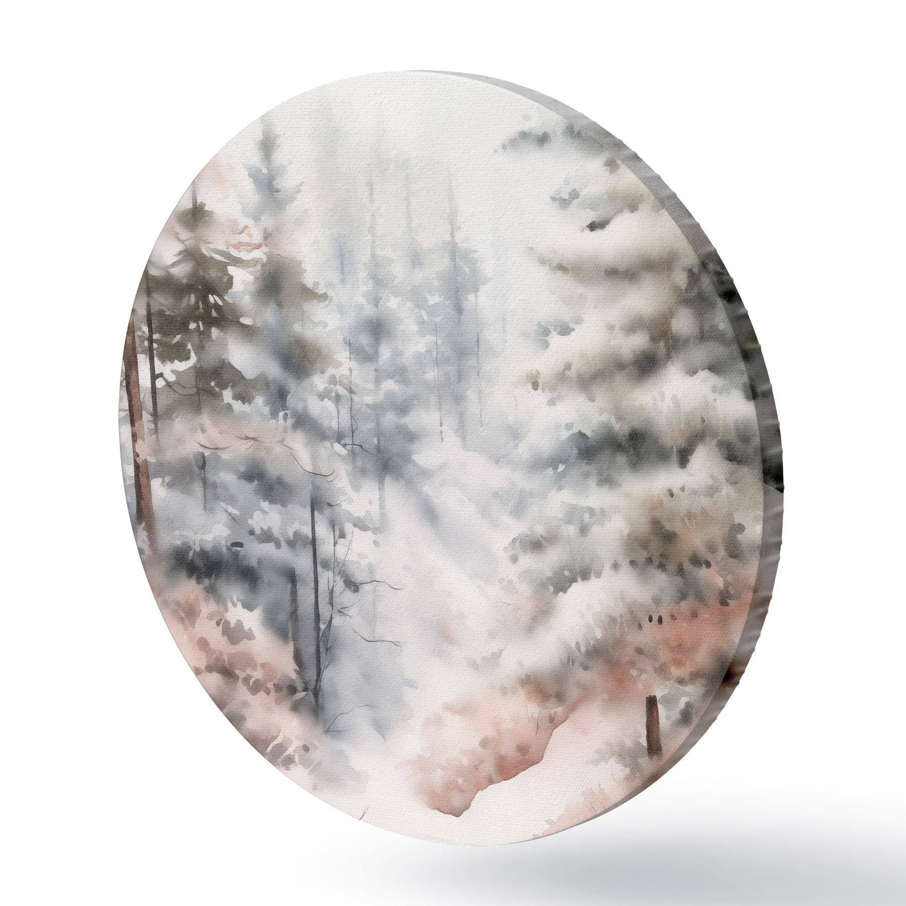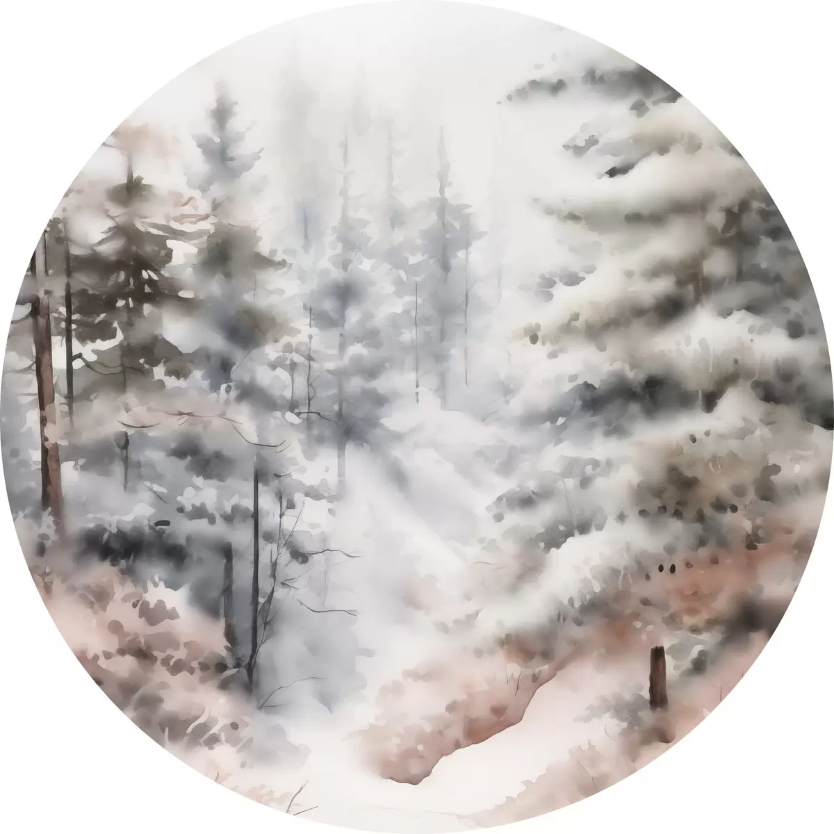 Кругла картина Високі сосни, вкриті снігом, стоять у туманному лісі, м'яка, приглушена зимова сцена Nr r46702