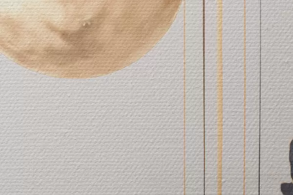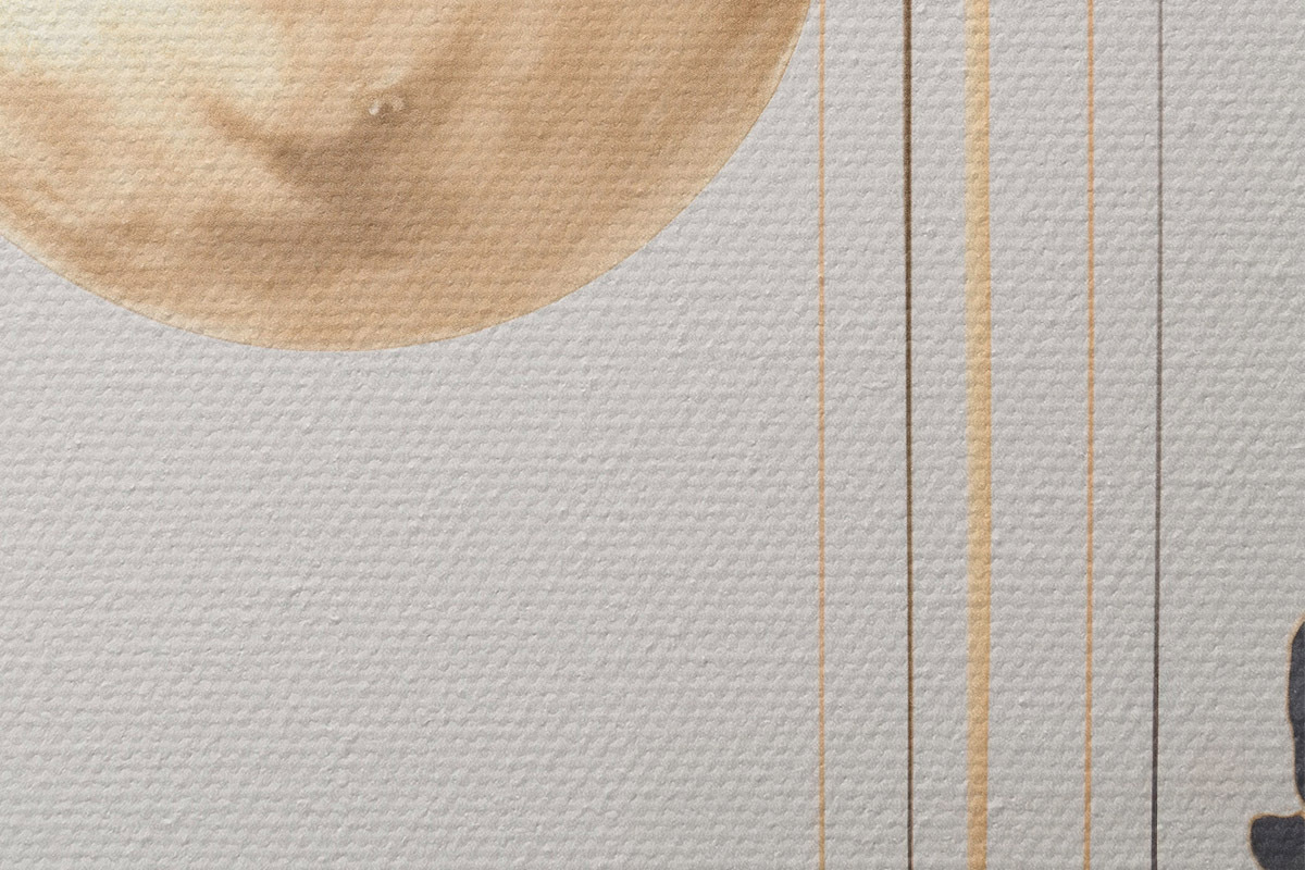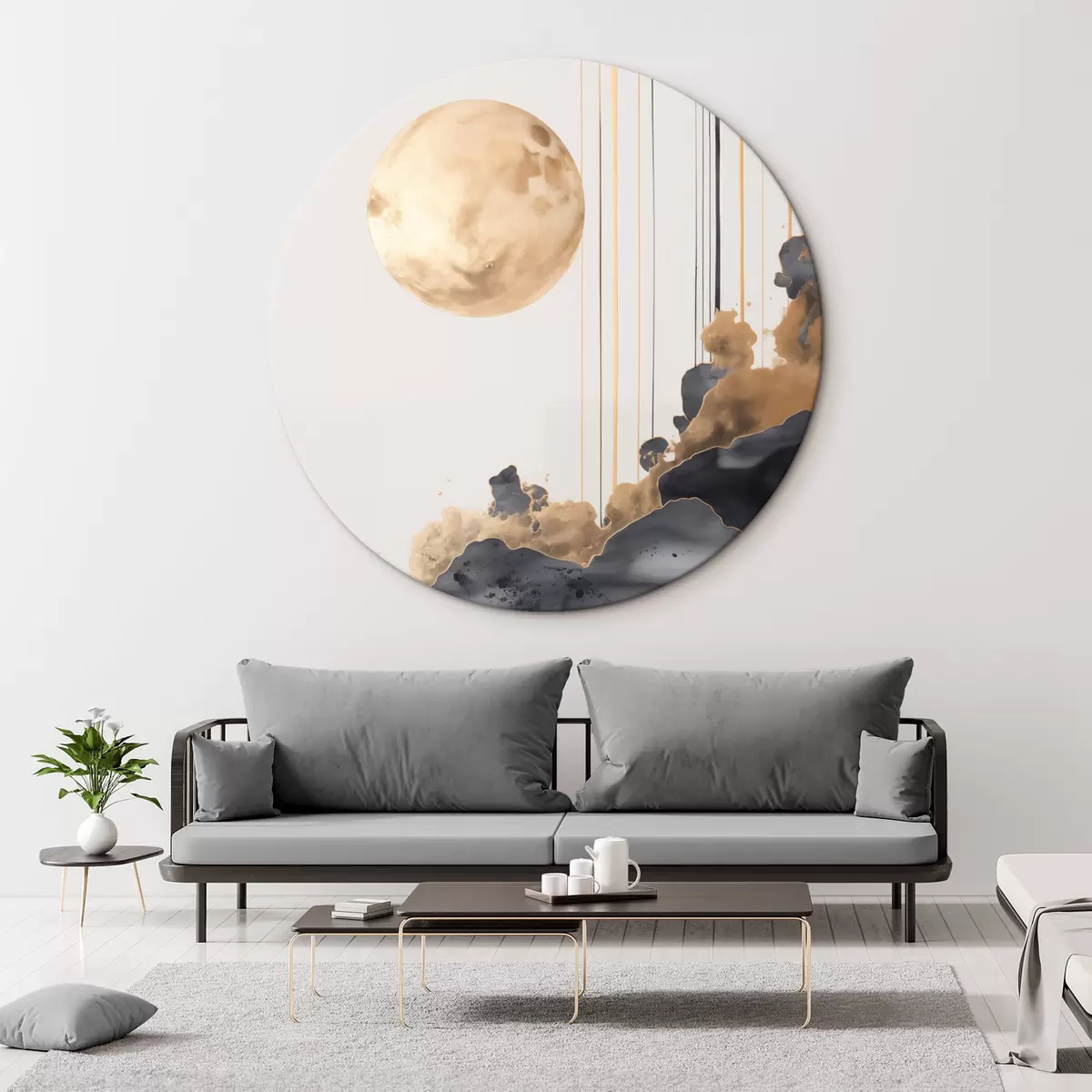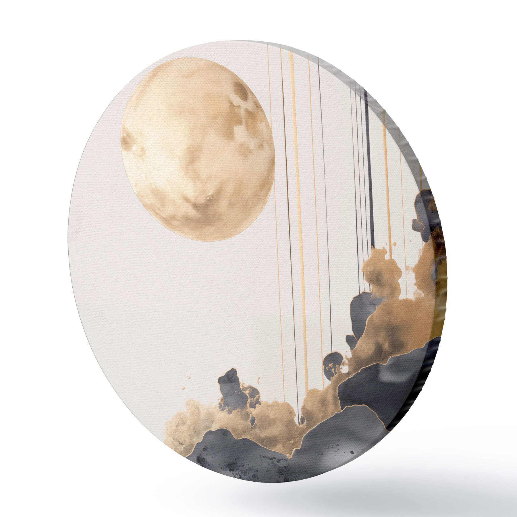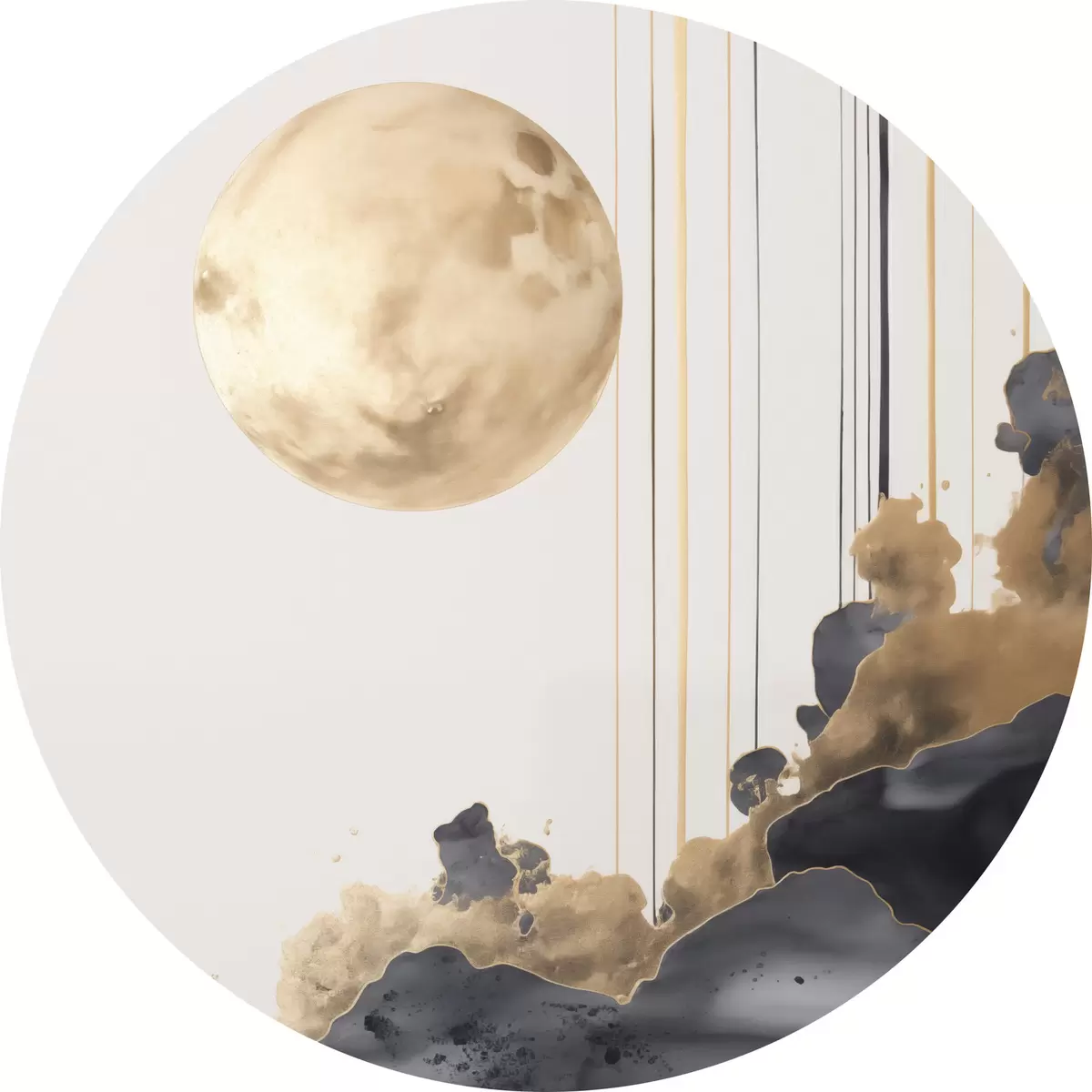 Кругла картина Повний місяць з чорними і текстурованими жовтими хмарами, вертикальними лініями, абстрактним стилем, мінімалістичним і сучасним r46707