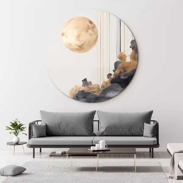 Кругла картина Повний місяць з чорними і текстурованими жовтими хмарами, вертикальними лініями, абстрактним стилем, мінімалістичним і сучасним Nr r46707