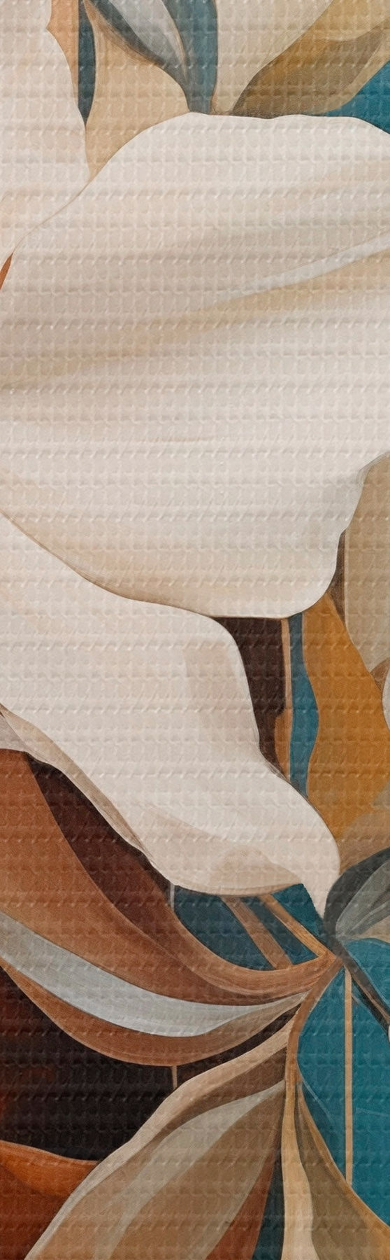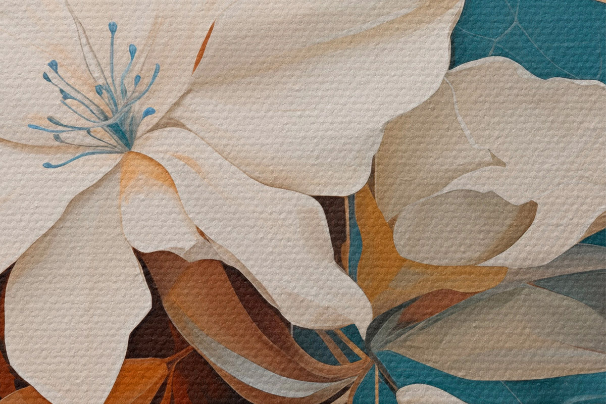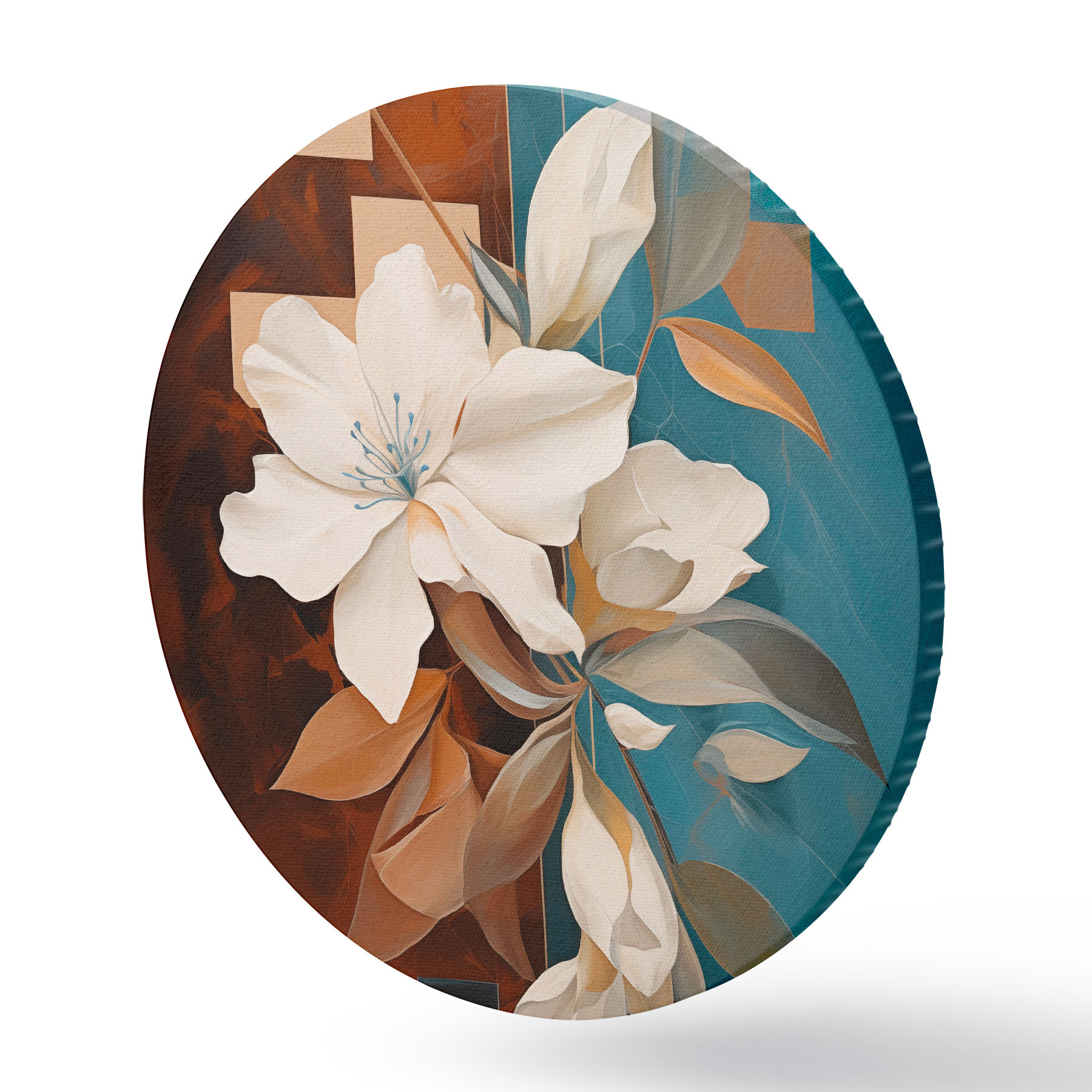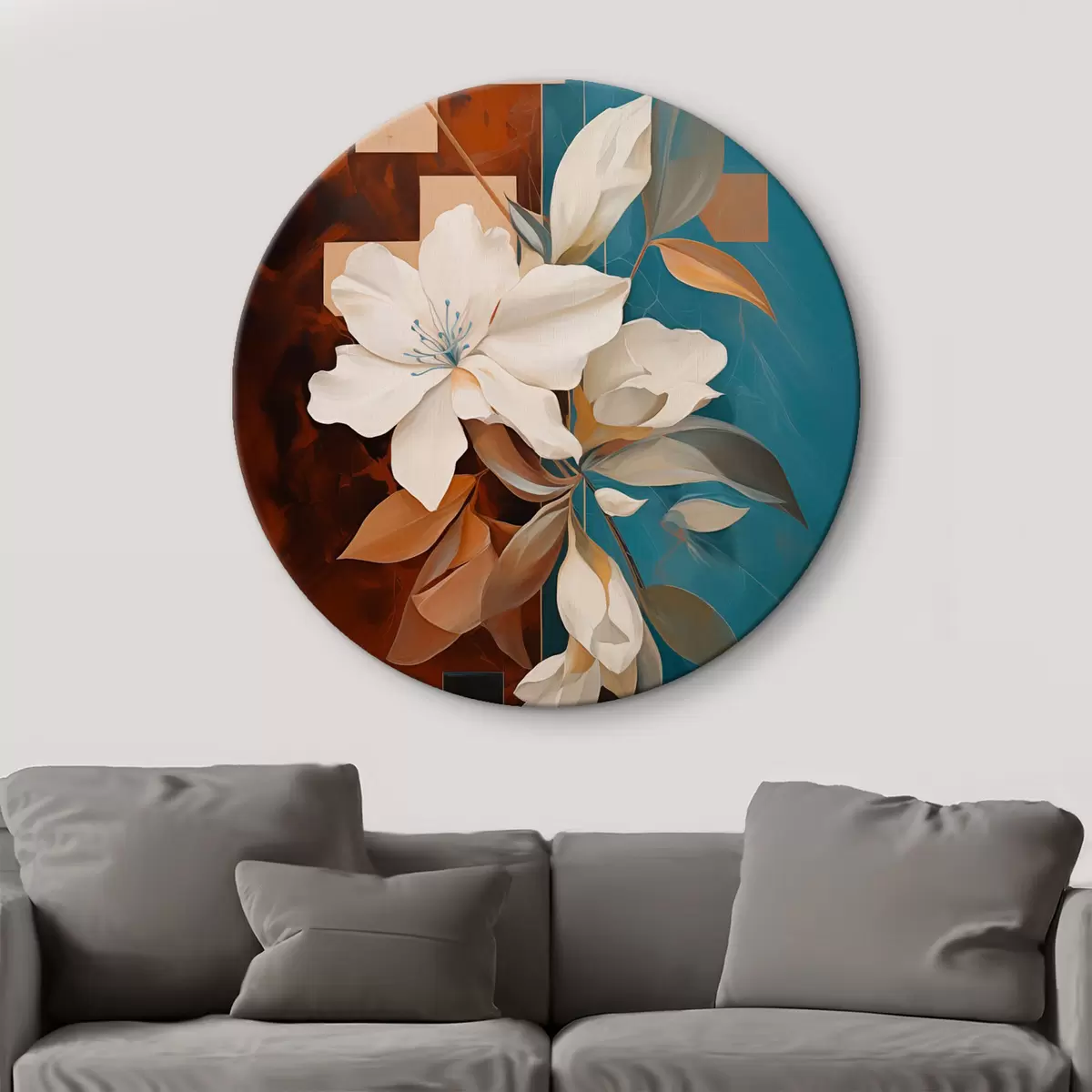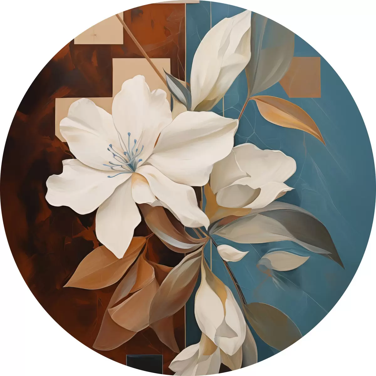 Кругла картина Абстрактні білі квіти та листя на тлі коричневого та синього кольорів з абстрактними формами, у мінімалістичному стилі Nr r46709