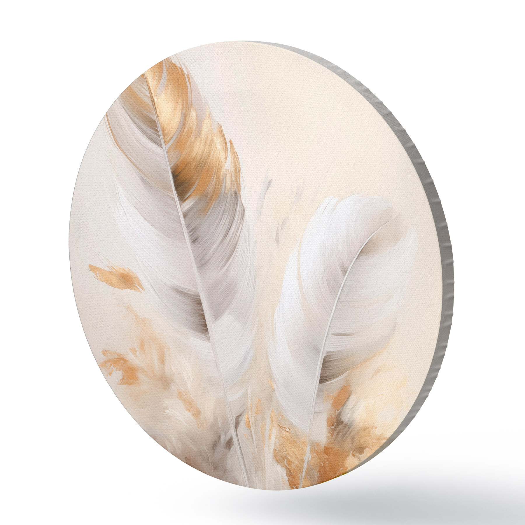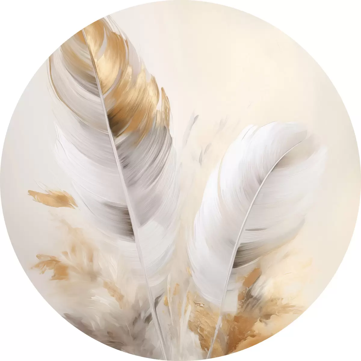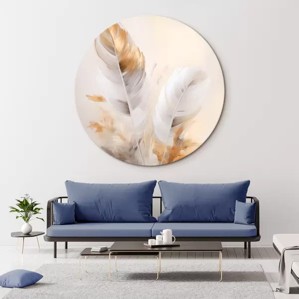 Кругла картина Абстрактні пір'я, оточені бежевими та коричневими пучками, м'які та ніжні, на світло-бежевому тлі r46711