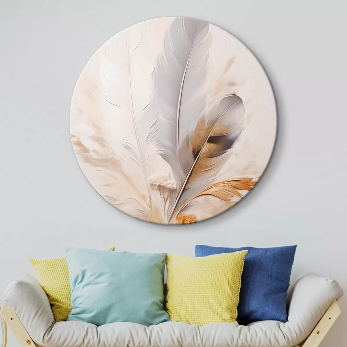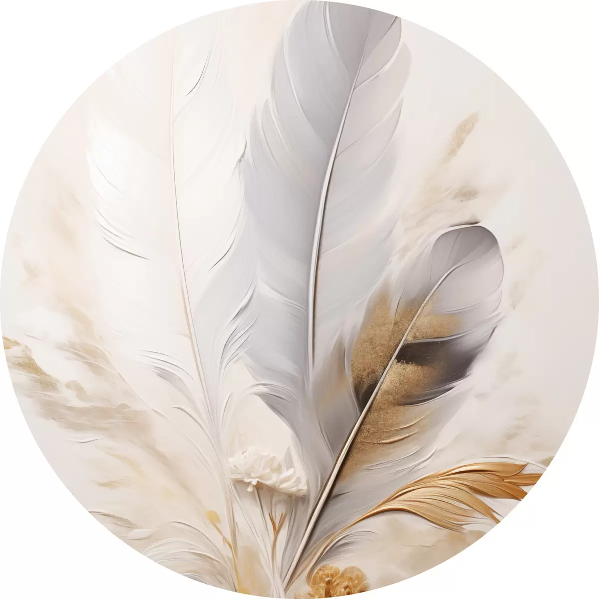 Кругла картина Абстрактні пір'я, оточені бежевими та коричневими пучками, м'які та ніжні, на світло-бежевому тлі r46712
