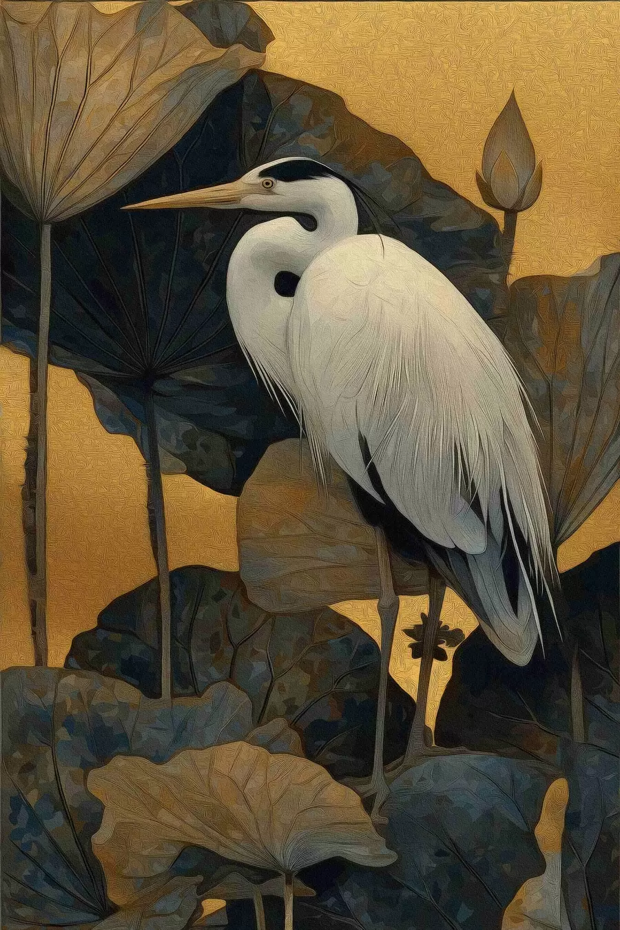 Чапля серед лотосів на теплому тлі