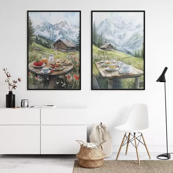 Постер на стіну Альпи, красиві гірські пейзажі, естетичний сніданок, дерев'яні будиночки Nr d00403