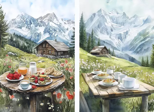 Постер на стіну Альпи, красиві гірські пейзажі, естетичний сніданок, дерев'яні будиночки Nr d00403