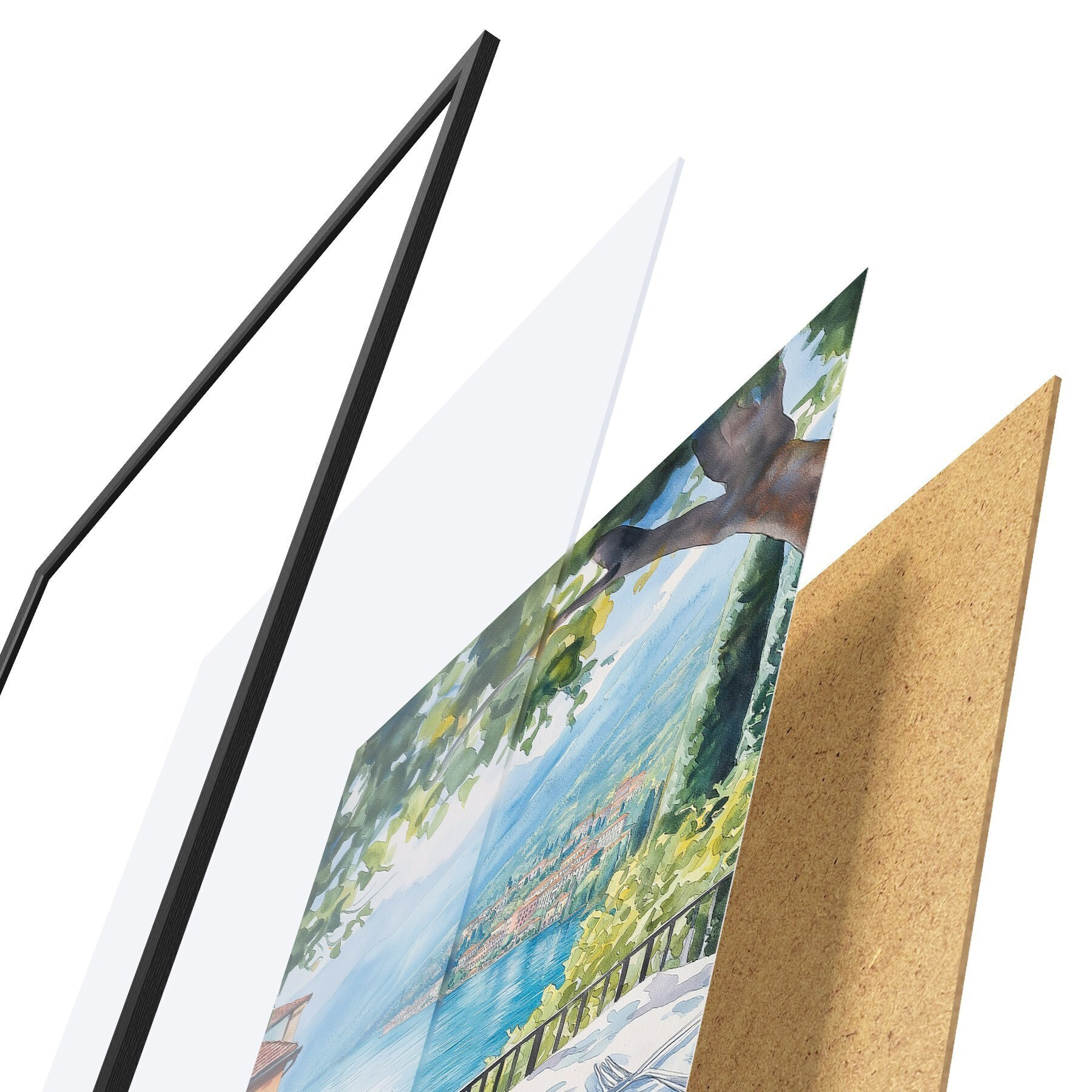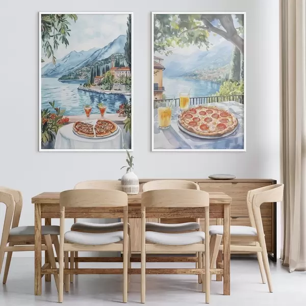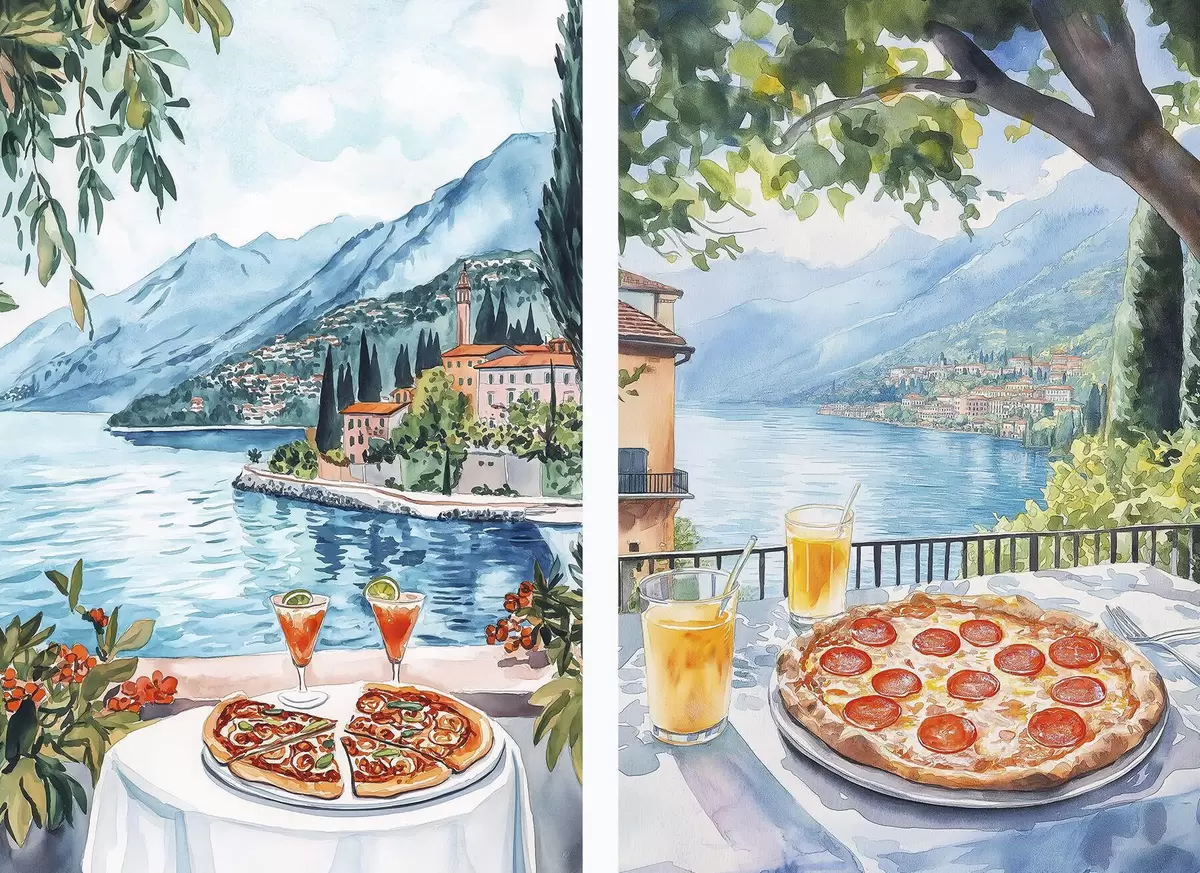 Постер на стіну Озеро Комо, бранч в Італії, акварельний стиль, піца маргарита, літня природа Nr d00406