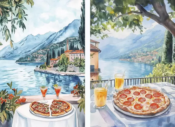 Постер на стіну Озеро Комо, бранч в Італії, акварельний стиль, піца маргарита, літня природа Nr d00406