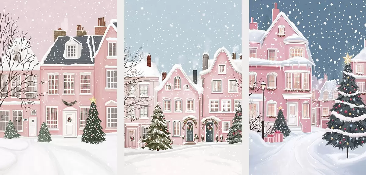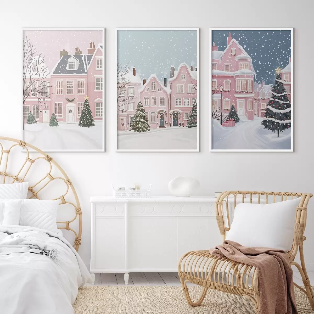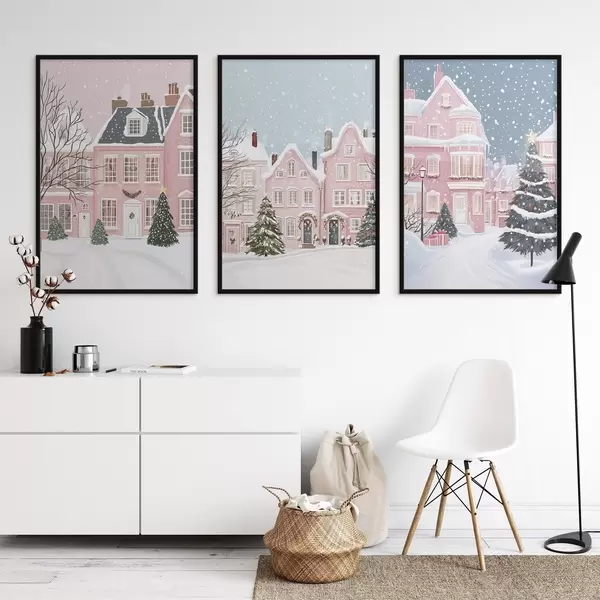 Постер на стіну Красиве зимове місто з рожевими будиночками, соснами, сніжинками Nr d00410