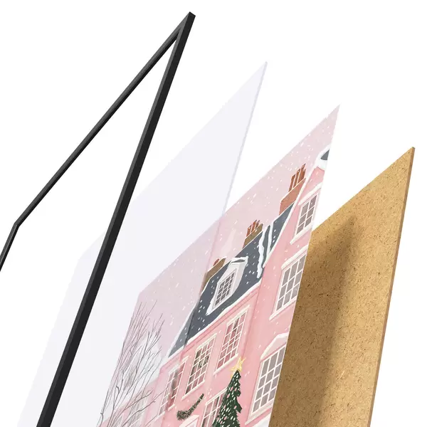 Постер складається з рами, оргскла, надрукованого зображення та підкладки з ДСП. Завдяки кріпленням на звороті плакат можна одразу ж повісити на стіну.