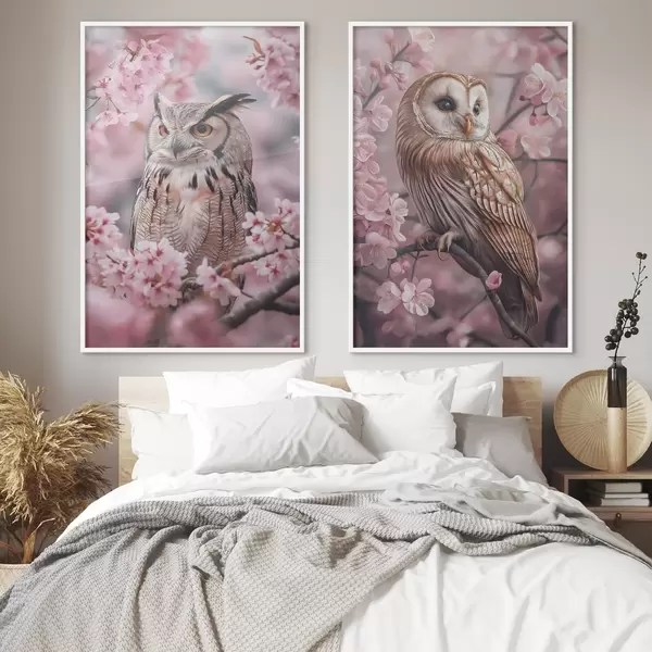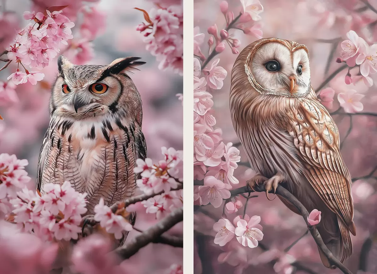 Постер на стіну Сови на вишні, рожеві квіти, реалізм, природа Nr d00411