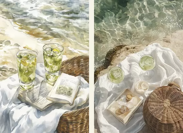Постер на стіну Коктейлі на пляжі, акварельний малюнок, океан, літній пікнік Nr d00417