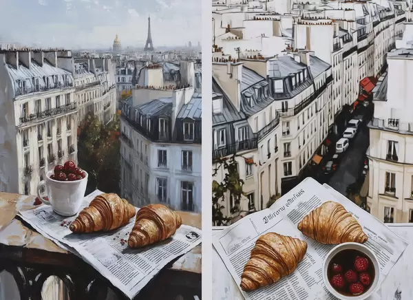 Постер на стіну Вид на місто з балкона в Парижі, Ейфелева вежа, полуниця, кава, журнал Nr d00445