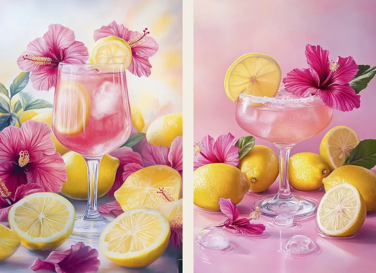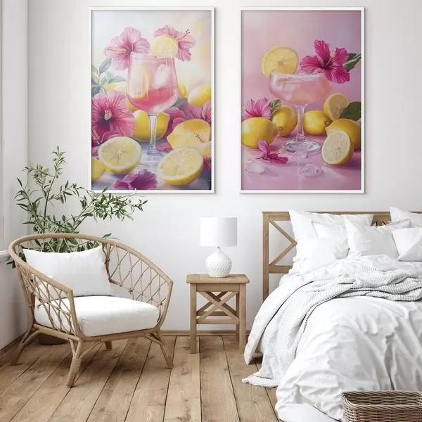 Постер на стіну Коктейлі з квітами гібіскусу та лимонами, літні, соковиті, акварельні Nr d00446