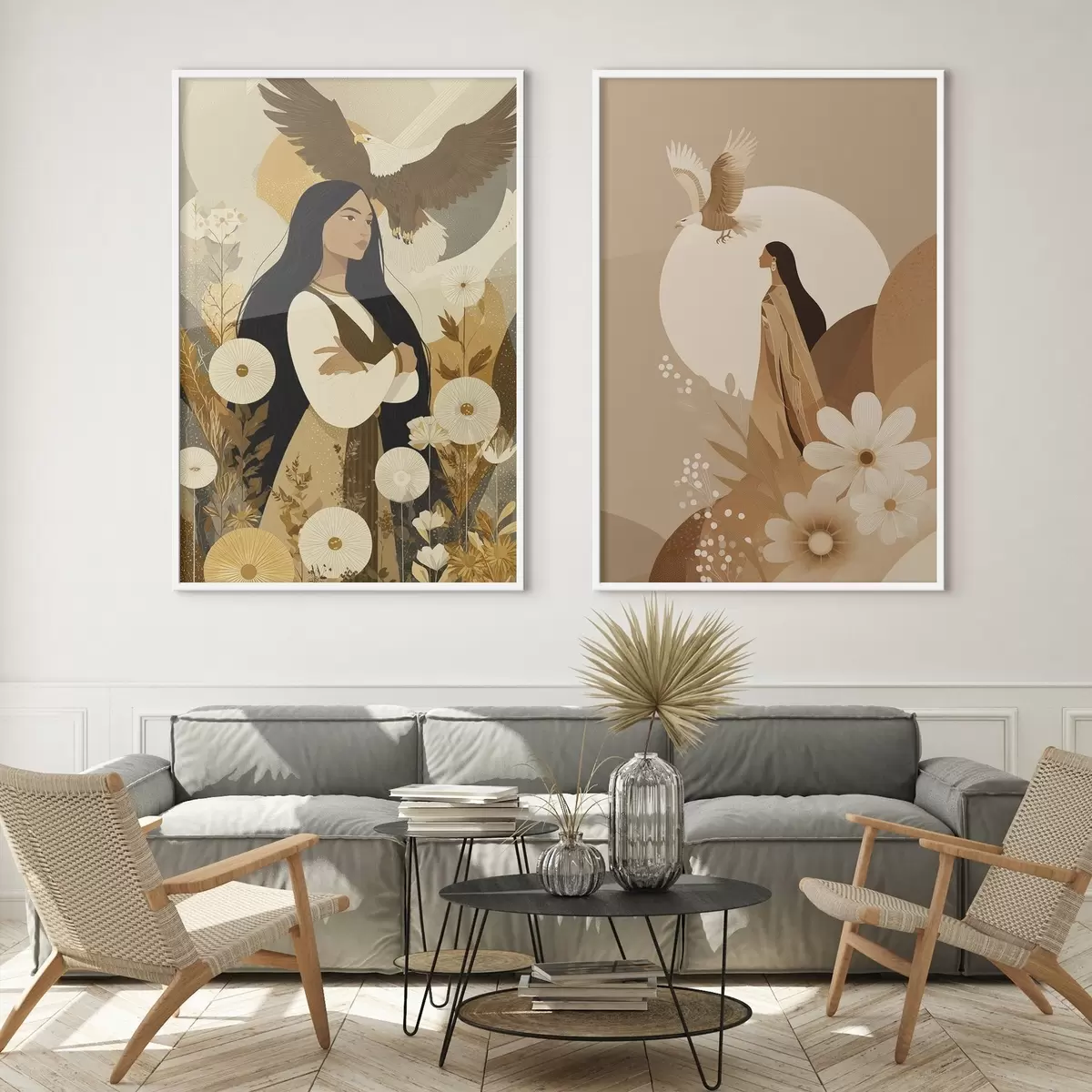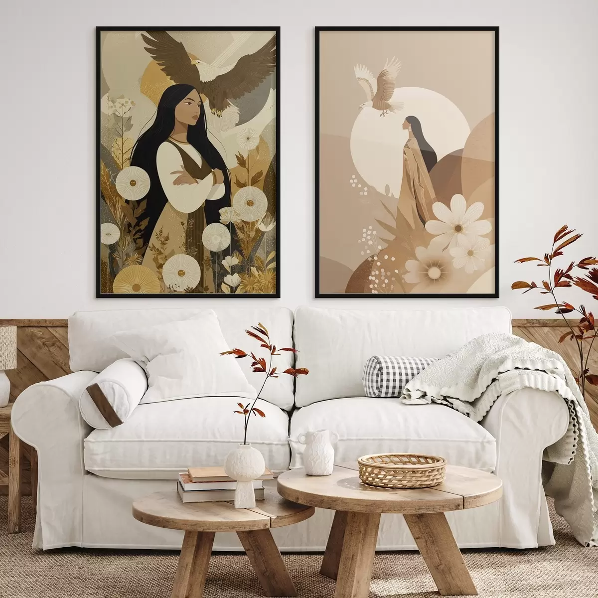Постер на стіну Жінки з орлами, племінний стиль, бежеві кольори Nr d00477