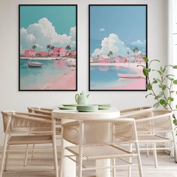 Постер на стіну Рожевий літній пляж із сонцем, вітрильником і будинками Nr d00479