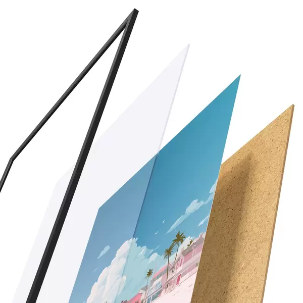 Постер складається з рами, оргскла, надрукованого зображення та підкладки з ДСП. Завдяки кріпленням на звороті плакат можна одразу ж повісити на стіну.