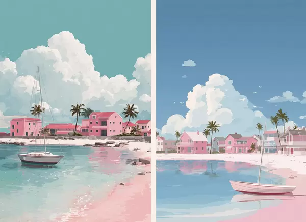 Постер на стіну Рожевий літній пляж із сонцем, вітрильником і будинками Nr d00479