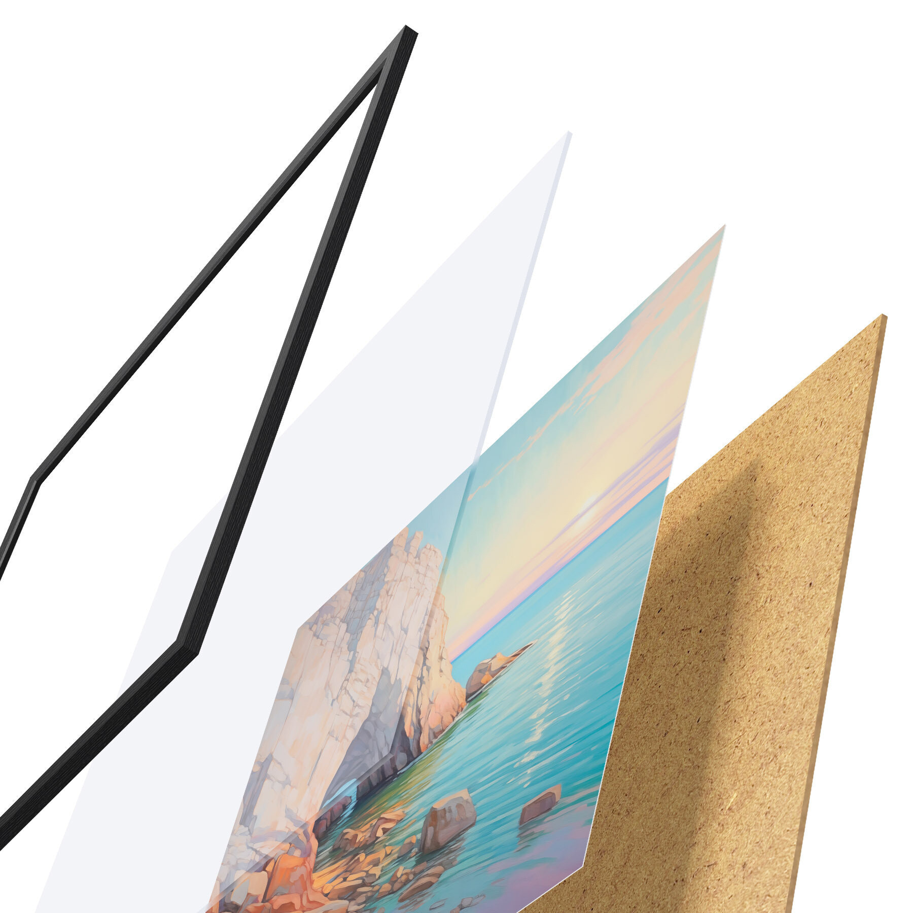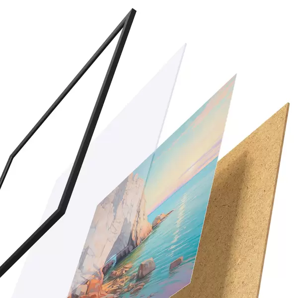 Постер складається з рами, оргскла, надрукованого зображення та підкладки з ДСП. Завдяки кріпленням на звороті плакат можна одразу ж повісити на стіну.