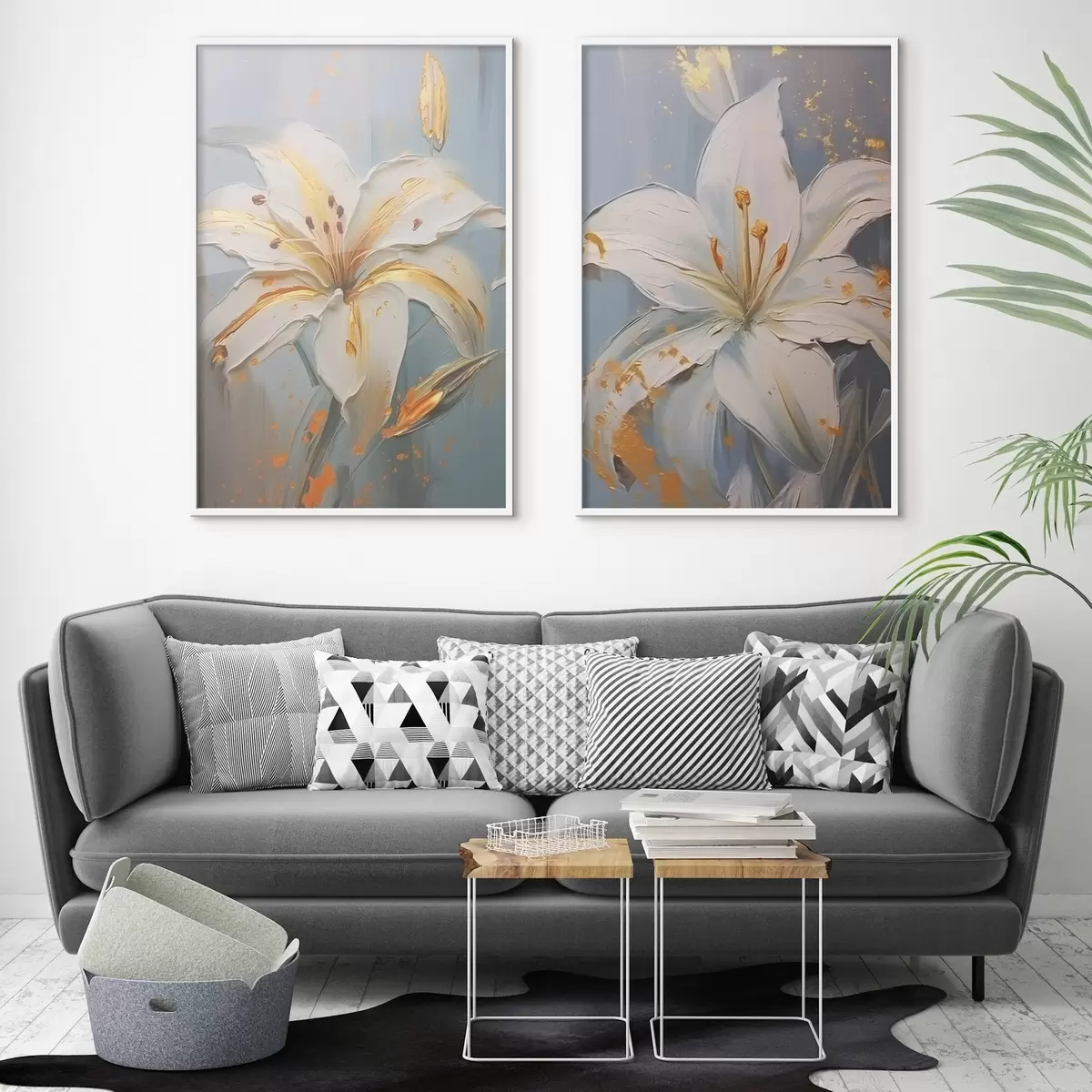 Постер на стіну Білі лілії з жовтими штрихами на блакитному тлі Nr d00497