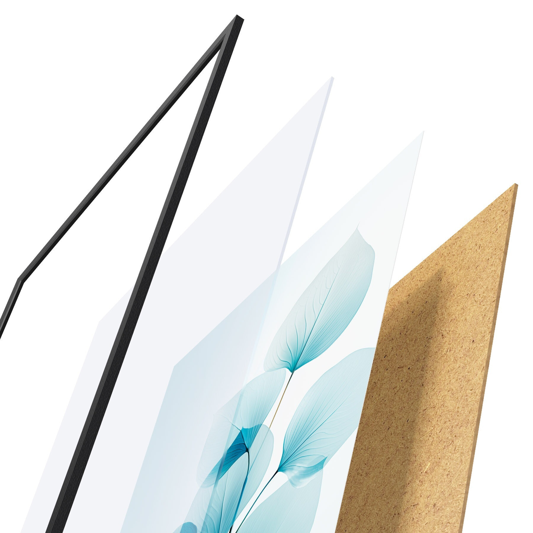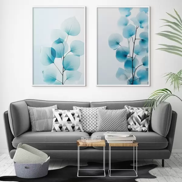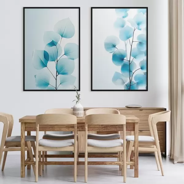 Постер на стіну Гілка з напівпрозорим блакитним листям, видно тонкі прожилки, легка і спокійна композиція, мінімалістична естетика Nr d00522