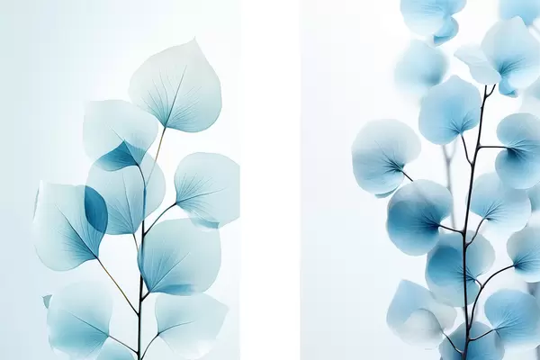 Постер на стіну Гілка з напівпрозорим блакитним листям, видно тонкі прожилки, легка і спокійна композиція, мінімалістична естетика Nr d00522