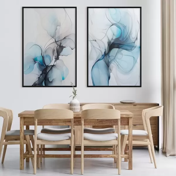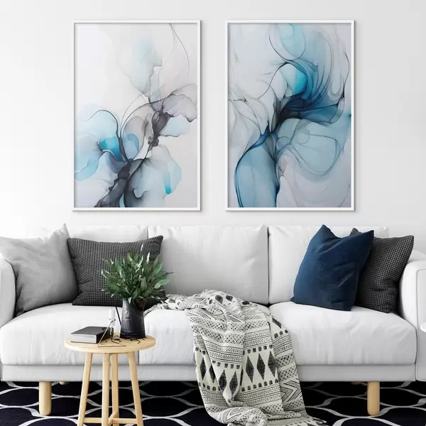 Постер на стіну Абстрактна композиція з плавними лініями та напівпрозорими пелюстками у відтінках синього, білого та бежевого, імітація спиртового чорнила Nr d00523