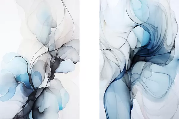 Постер на стіну Абстрактна композиція з плавними лініями та напівпрозорими пелюстками у відтінках синього, білого та бежевого, імітація спиртового чорнила Nr d00523