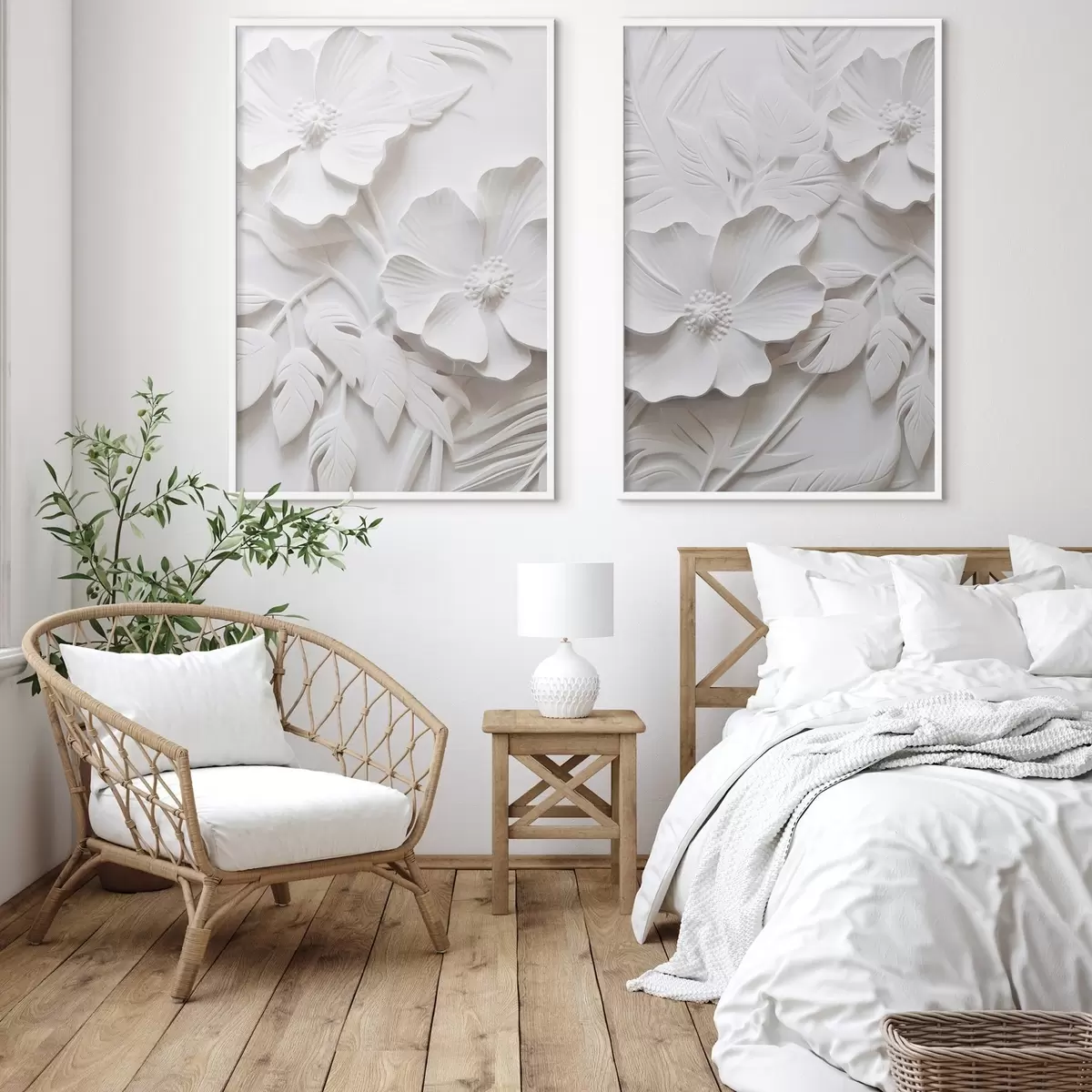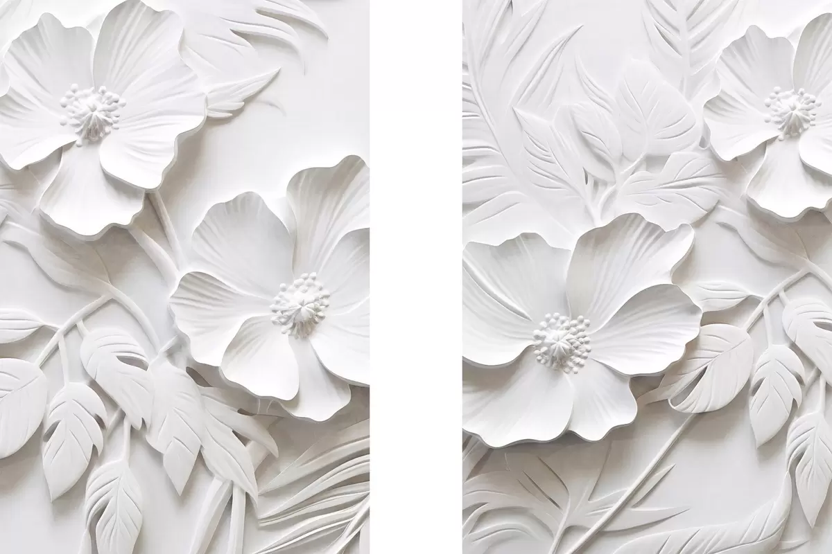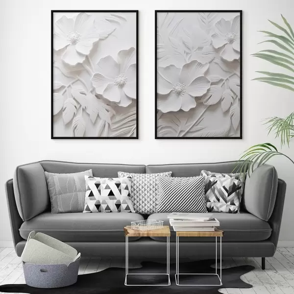 Постер на стіну Декоративні мінімалістичні білі квіти з листям, імітація рельєфу, білий фон Nr d00524