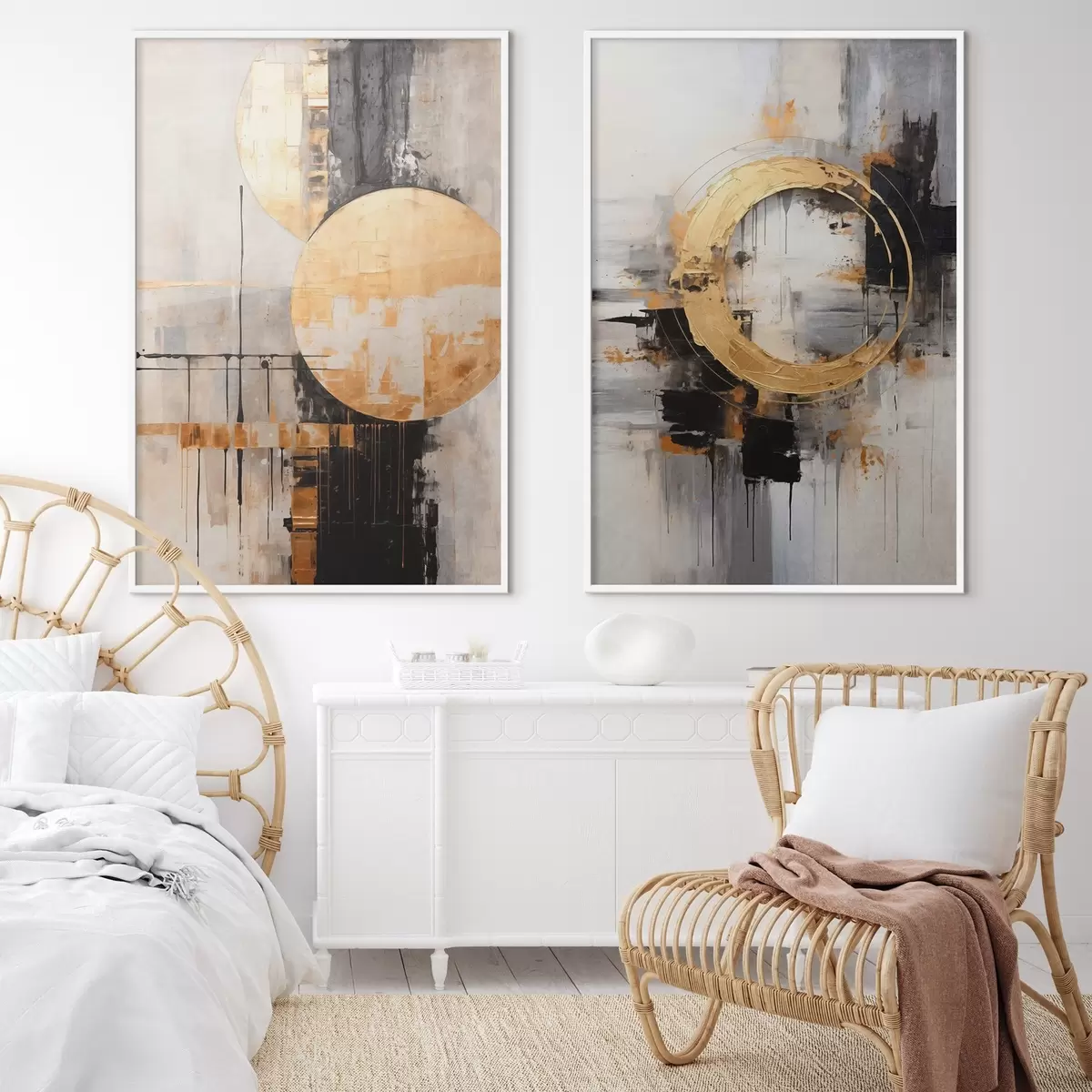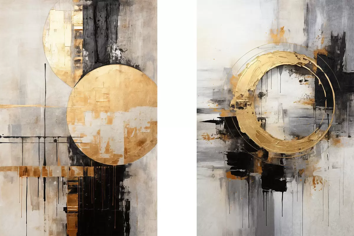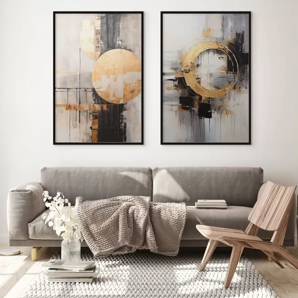 Постер на стіну Абстрактний живопис з колами, чорними та жовтими лініями та тлом з сірими та білими тонами Nr d00527