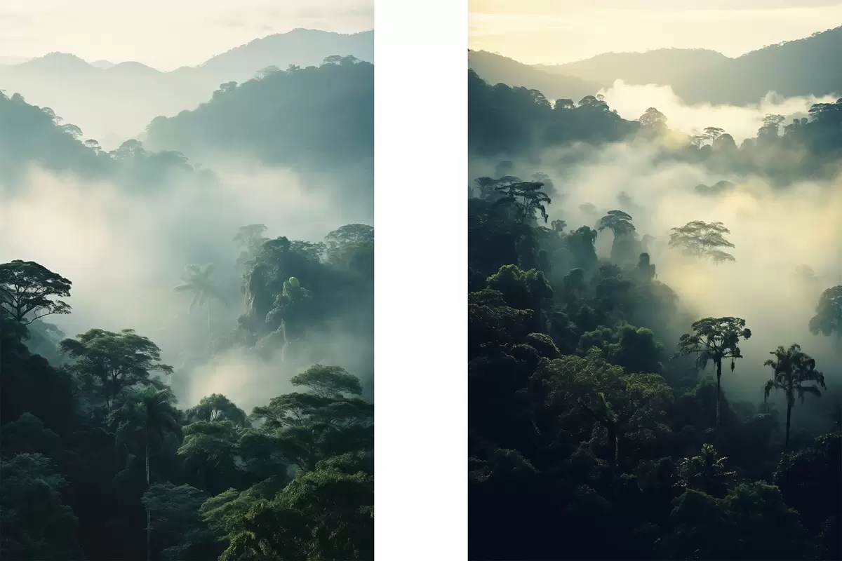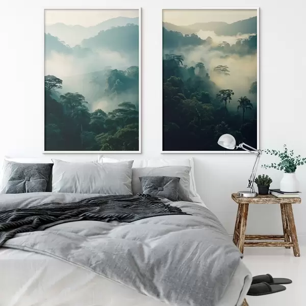 Постер на стіну Тропічний дощовий ліс з пишними зеленими деревами і густим шаром туману, що створює атмосферне середовище Nr d00529