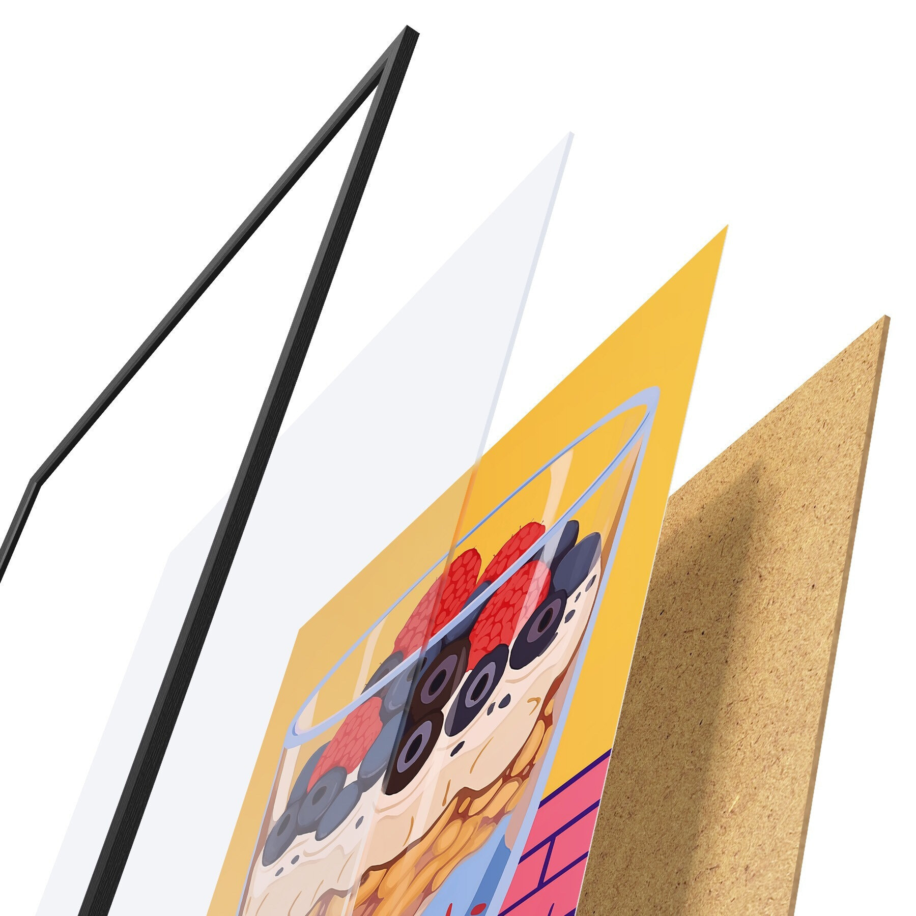 Постер складається з рами, оргскла, надрукованого зображення та підкладки з ДСП. Завдяки кріпленням на звороті плакат можна одразу ж повісити на стіну.