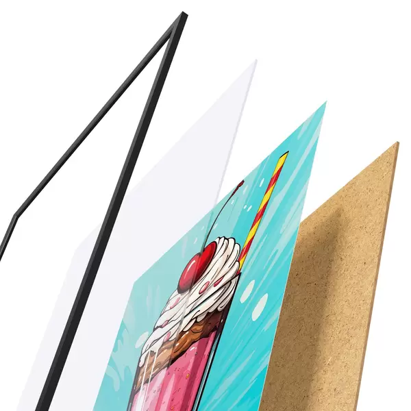 Постер складається з рами, оргскла, надрукованого зображення та підкладки з ДСП. Завдяки кріпленням на звороті плакат можна одразу ж повісити на стіну.