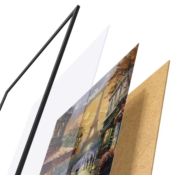 Постер складається з рами, оргскла, надрукованого зображення та підкладки з ДСП. Завдяки кріпленням на звороті плакат можна одразу ж повісити на стіну.