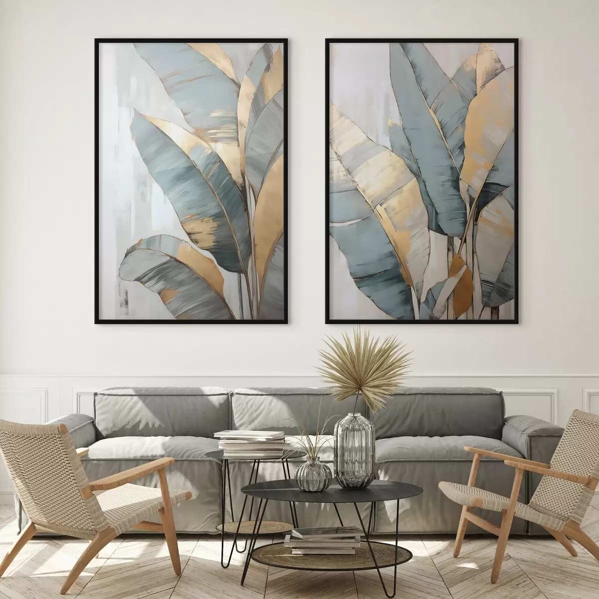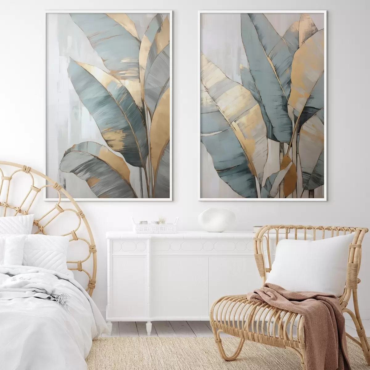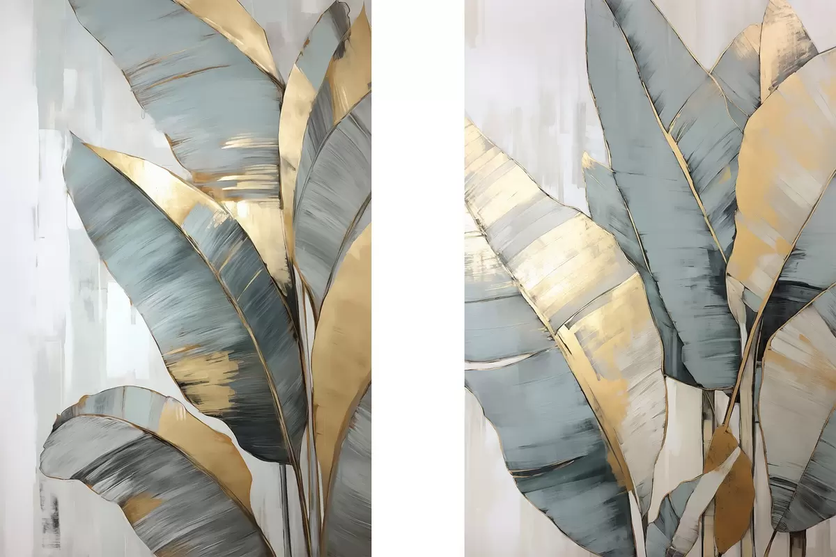 Постер на стіну Набір приглушеного синього, сірого та жовтого бананового листя з видимими мазками пензля на білому абстрактному тлі Nr d00645