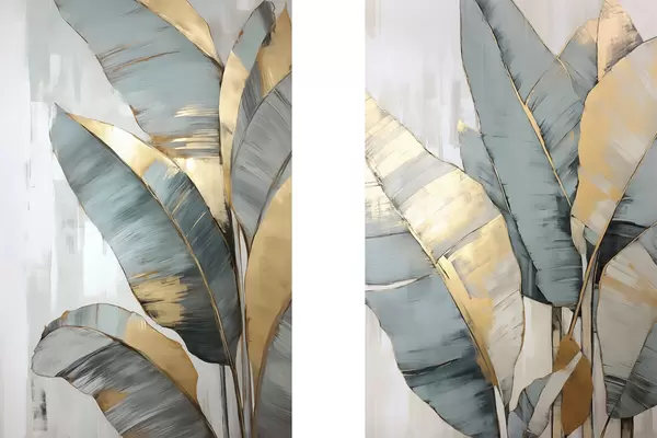 Постер на стіну Набір приглушеного синього, сірого та жовтого бананового листя з видимими мазками пензля на білому абстрактному тлі Nr d00645