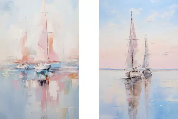 Постер на стіну Вітрильники з рожевими вітрилами, що пливуть по спокійному морю, відблиски човнів у воді, м'які пастельні кольори Nr d00648