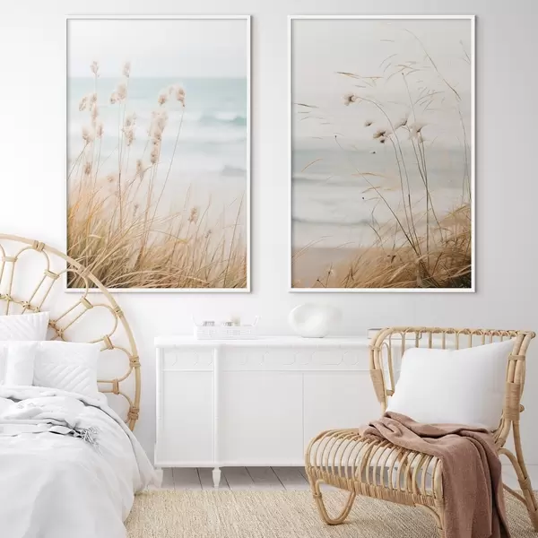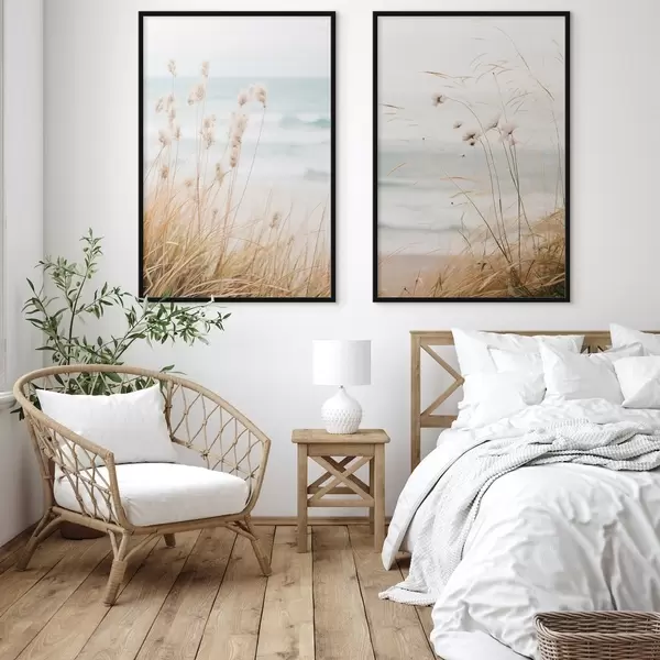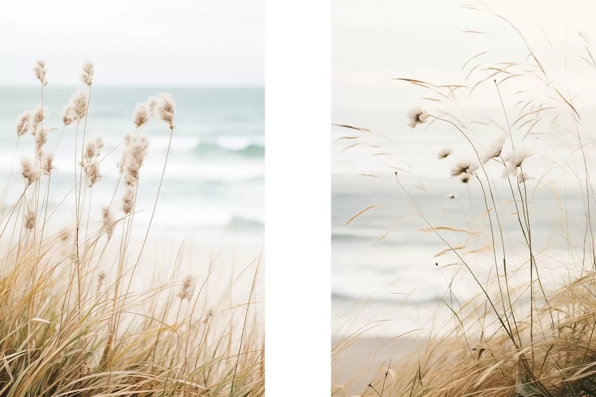 Постер на стіну Висока трава з пухнастими насінням, піщаний пляж і океанські хвилі на задньому плані, м'яка і приглушена кольорова гама Nr d00650