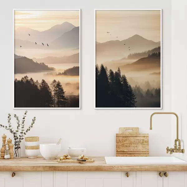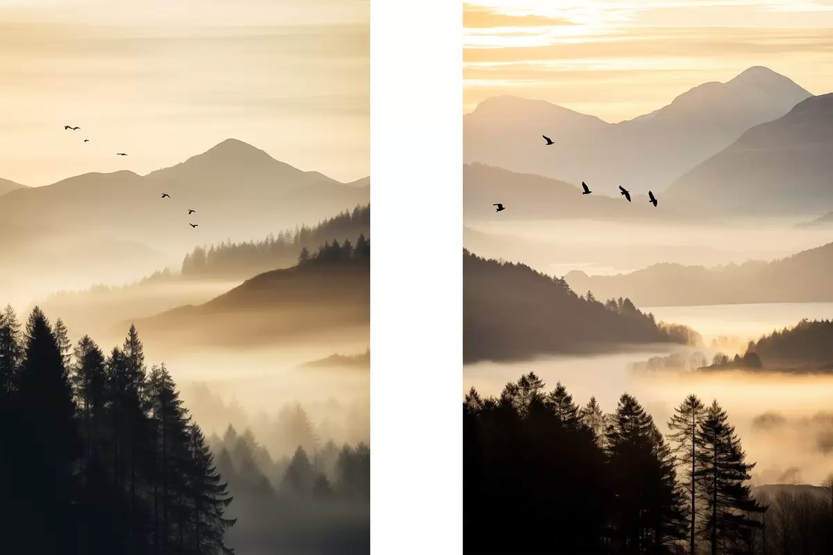 Постер на стіну Гірський пейзаж з лісом і птахами, що літають у небі, вкритий товстим шаром туману під час сходу сонця Nr d00651