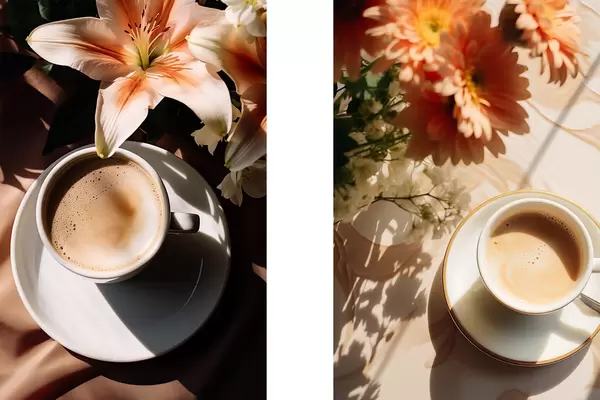 Постер на стіну Чашка кави з пінкою на білій тарілці, квіти на задньому плані, сонячне світло Nr d00654