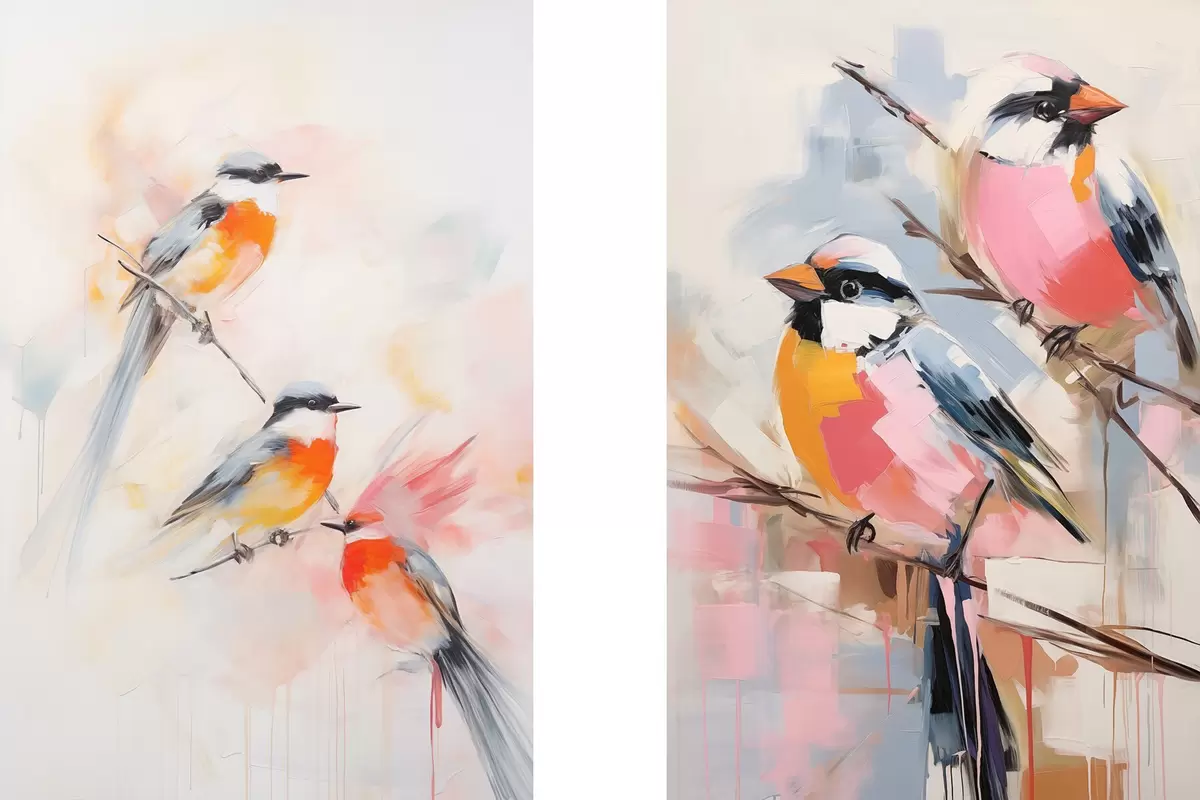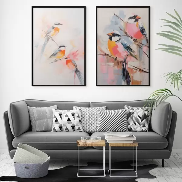 Постер на стіну Птахи на гілках, м'які пастельні кольори, світле тло з рожевими та білими відтінками Nr d00658