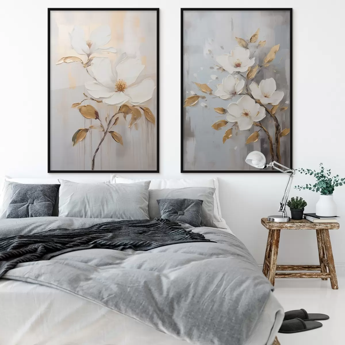 Постер на стіну Дві білі квітки з жовто-помаранчевим листям на світлому фоні Nr d00687