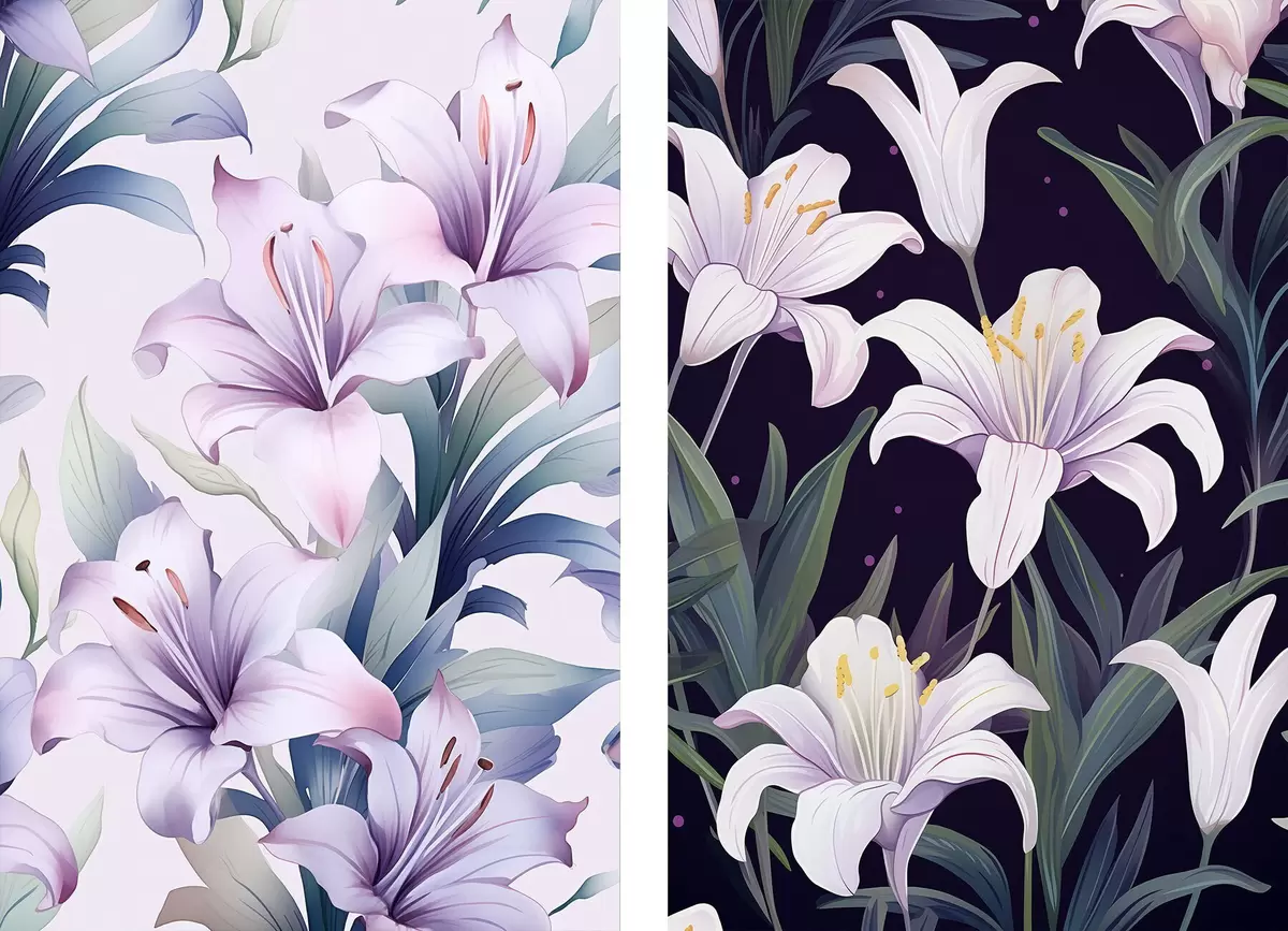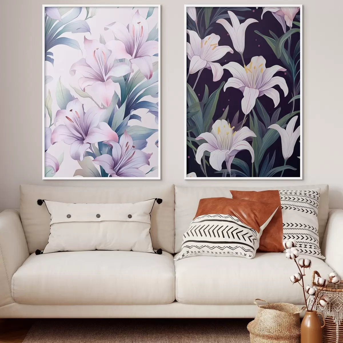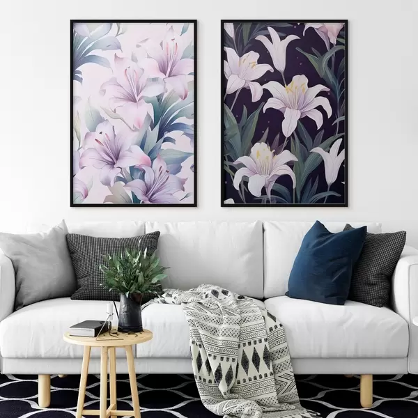 Постер на стіну Ніжні рожеві лілії з зеленим листям на світлому і темному тлі Nr d00689