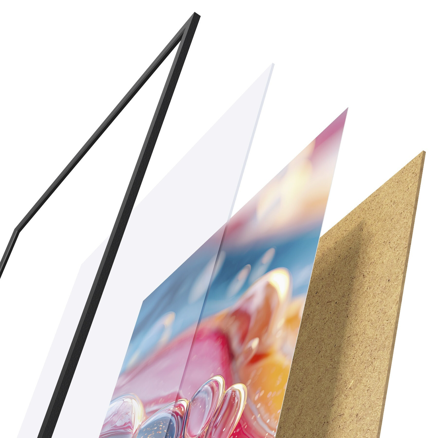 Постер складається з рами, оргскла, надрукованого зображення та підкладки з ДСП. Завдяки кріпленням на звороті плакат можна одразу ж повісити на стіну.